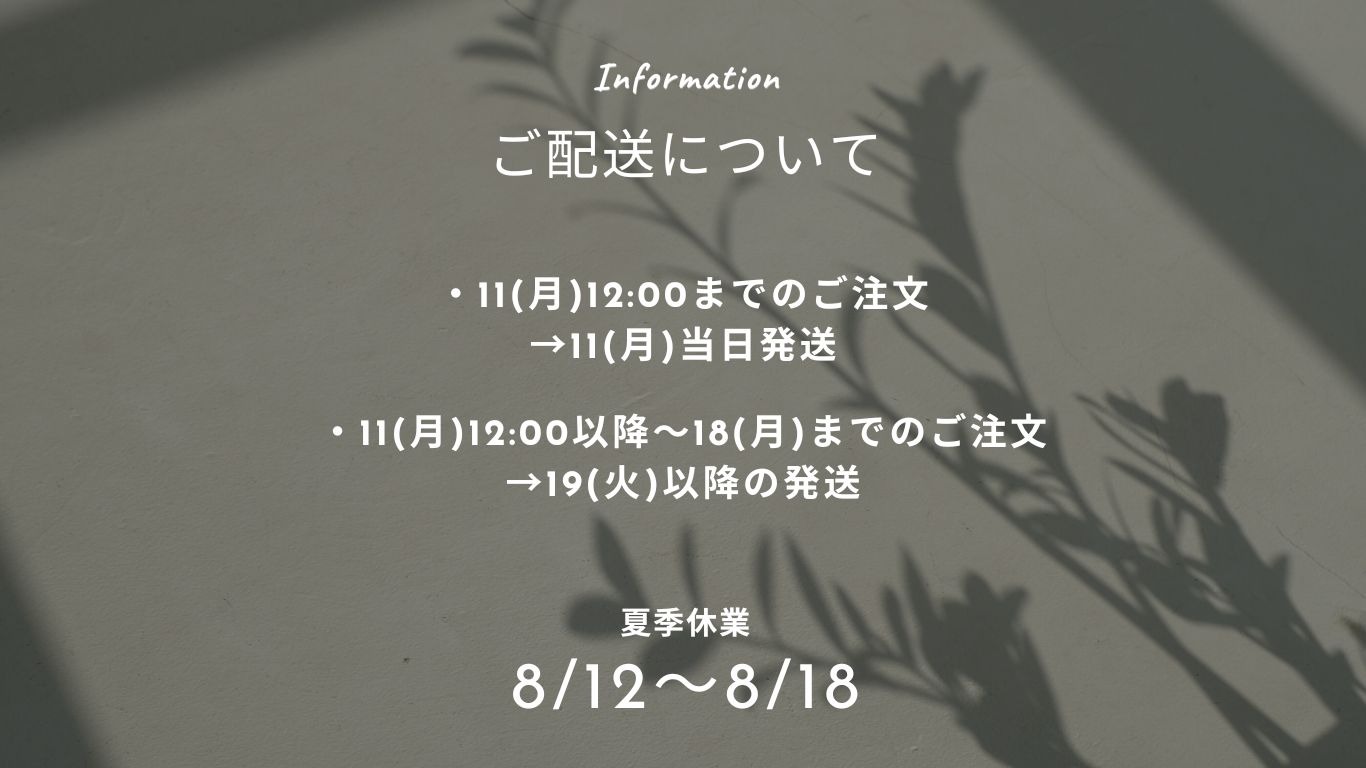 ※ご注文いただきました商品の発送ならびにお問い合わせにつきましては、休業明け19(火)以降のご対応となりますので何卒ご了承くださいませ。
