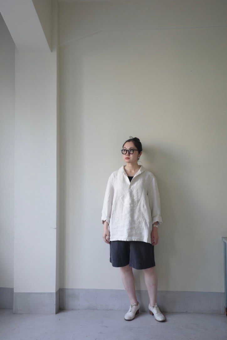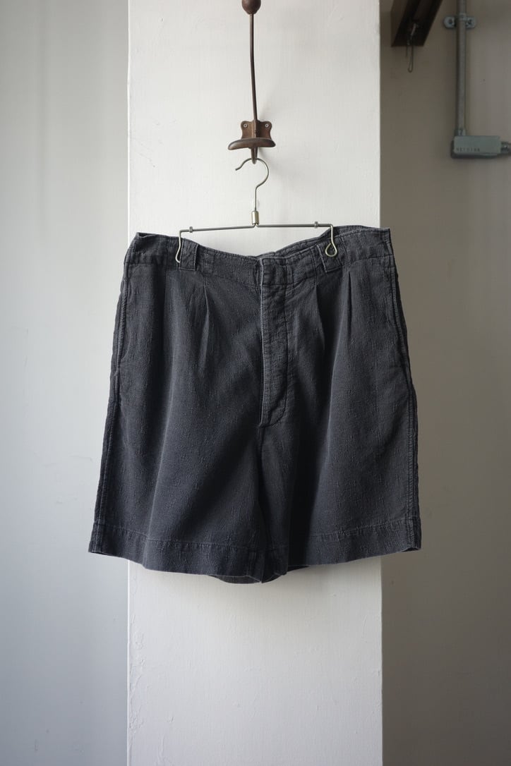 フランス海軍のリネンショートパンツを元にしたデザイン。フロント左右に2タックが入り、裾にかけてやや広がる膝上丈のシルエット。裾はタタキ仕上げしてからロールアップし、糸止めを施した仕様です。