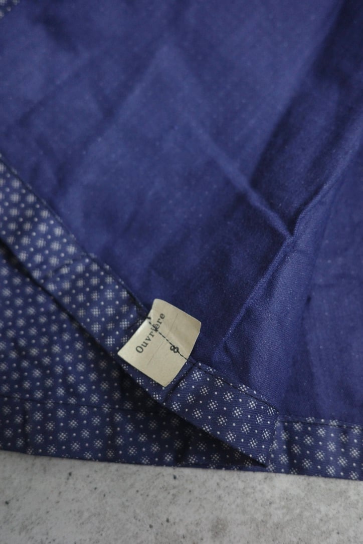 推定1920~30年代頃のフランスで作られたエプロン。シックな抜染プリントがクラシカルな1着です。肩紐、背面はボタンで留める仕様で、ドレスのようなデザインです。パープルが混じったようなブルーの色味も素敵です。
