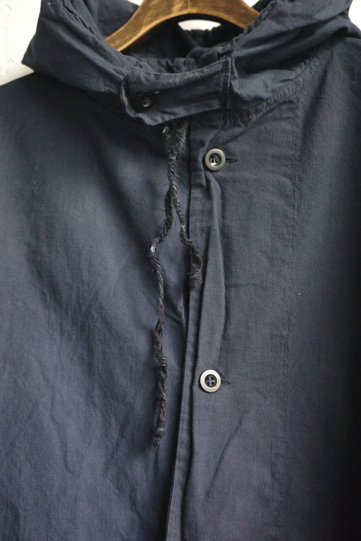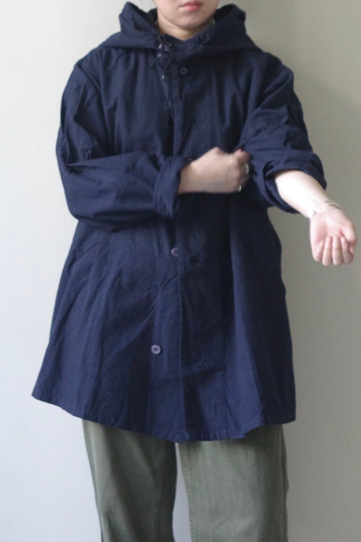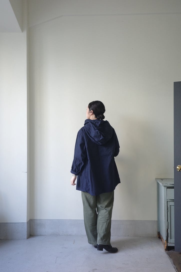 とても大きなフードがポイントで、シンプルなデザインながらも愛着のわく部分。リネンが混じっているような風合い豊かなコットン素材で仕立てられており、シワも良い味わいに映ります。お袖をぐっとまくり、シャツのような感覚で取り入れられるアウターです。