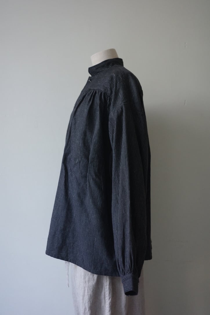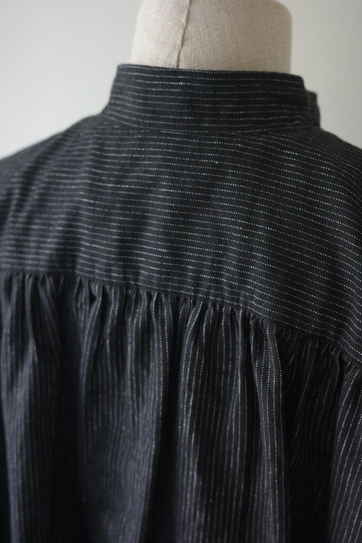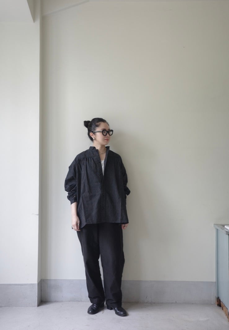 生地はコットンリネン。リネン特有のシャリ感が残る質感で、真夏以外の3シーズン着用いただける厚みです。細やかなストライプ柄はあえて裏生地を使用。その為柄がパキッとしすぎず、経年変化でかすれたようなvintage感ある佇まいに。さりげないストライプは無地のように合わせやすいので、普段柄物をお召しにならない方にもおすすめです。