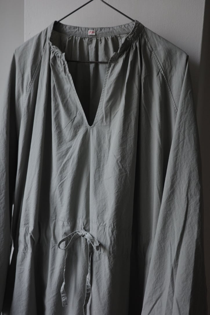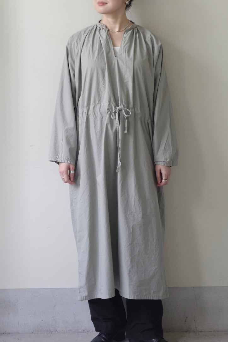 小さな襟と控えめなギャザー、鎖骨がちらっと覗くスキッパー。ドローコードでウエストのボリュームを調整でき、裾は広がり過ぎずにストンと落ちてゆくボトムのライン。そして、ラグランの袖付け+立体感とカーブを描く袖が、このドレスの”ヴィンテージ”な表情を作り上げています。