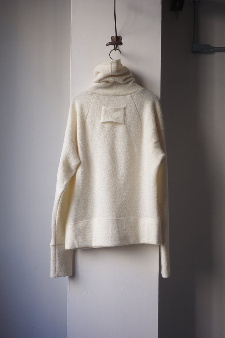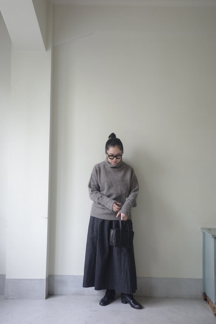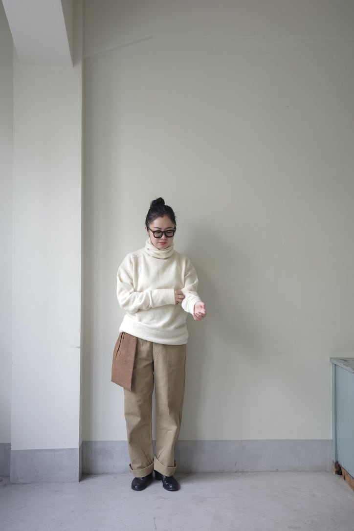 首元にたっぷりとボリュームをもたせたソフトフィットのタートルネックセーター。人体構造に基づいたパターンメイクのボディで、ネック部分はボリューム感が出るよう長めのデザインになっています。もちろん折り返して着用することも可能です。ゆるゆるっとラフに着るイメージでサイズ2をセレクトしまいた。