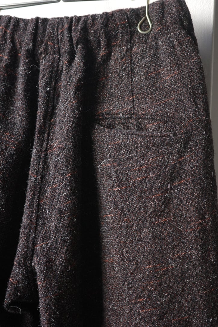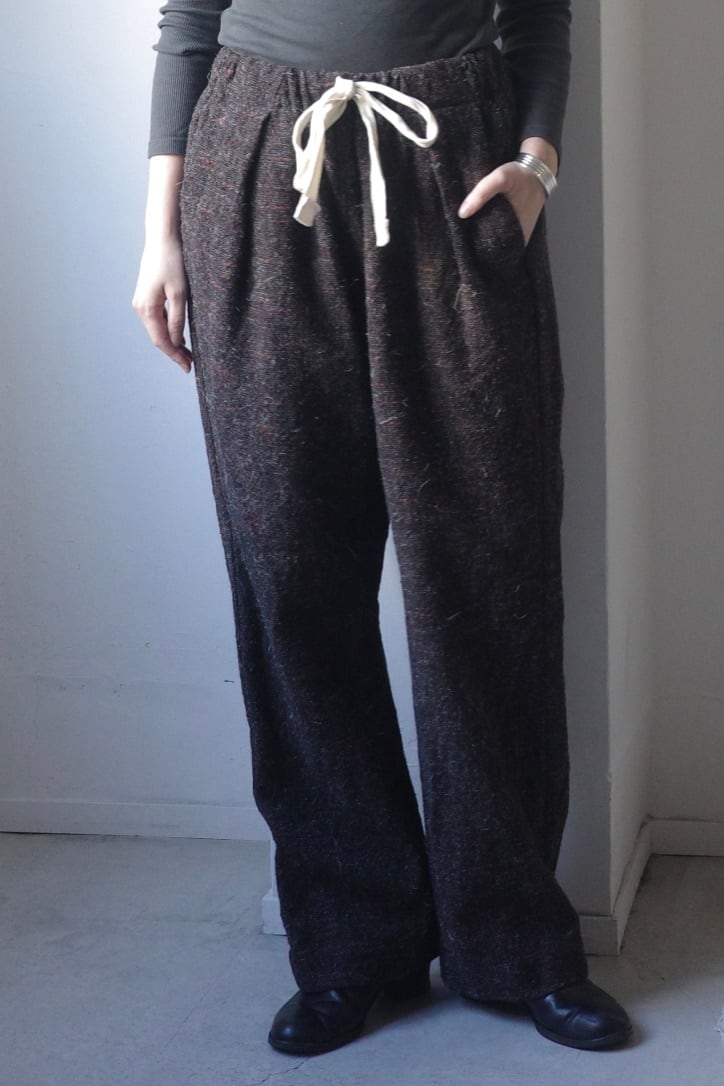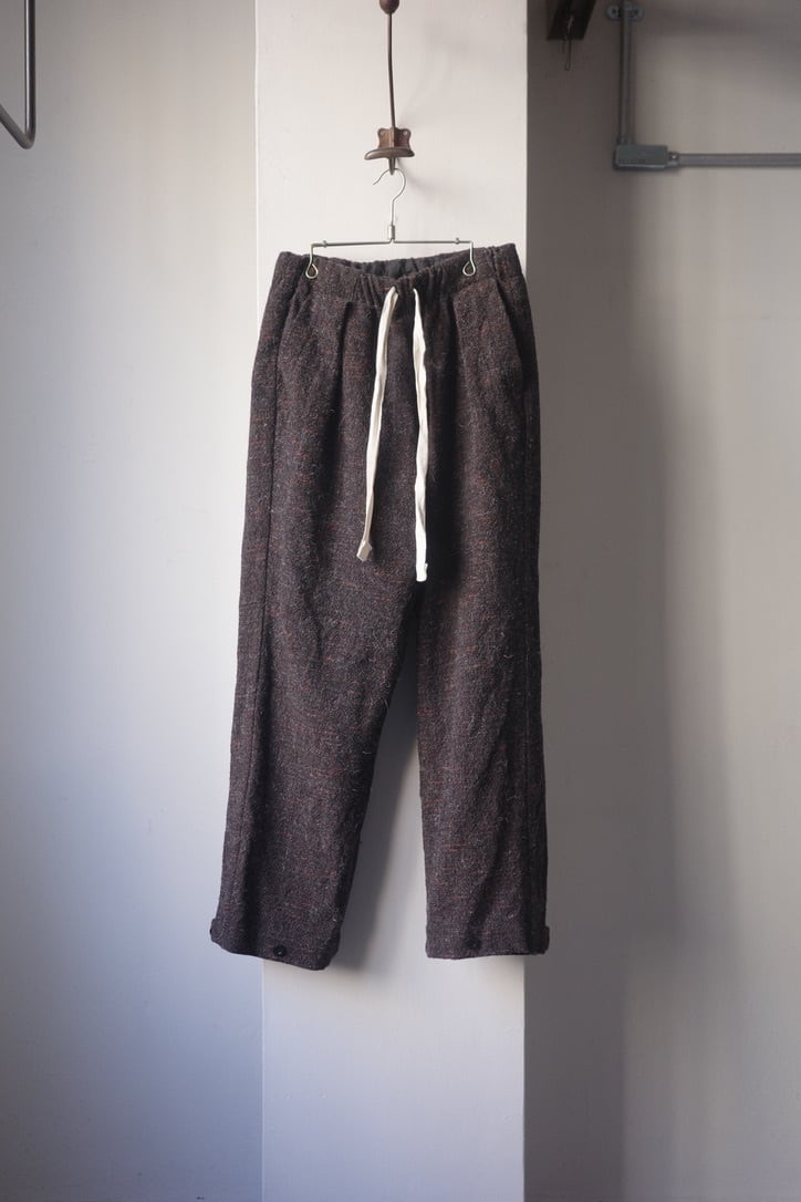 膝下から緩やかにテーパードになっている、ワイドテーパードシルエットです。ウエストはゴムと紐になっているイージーパンツの仕様。裾にはボタンが付いているので、シルエットに変化を持たせることもできます。