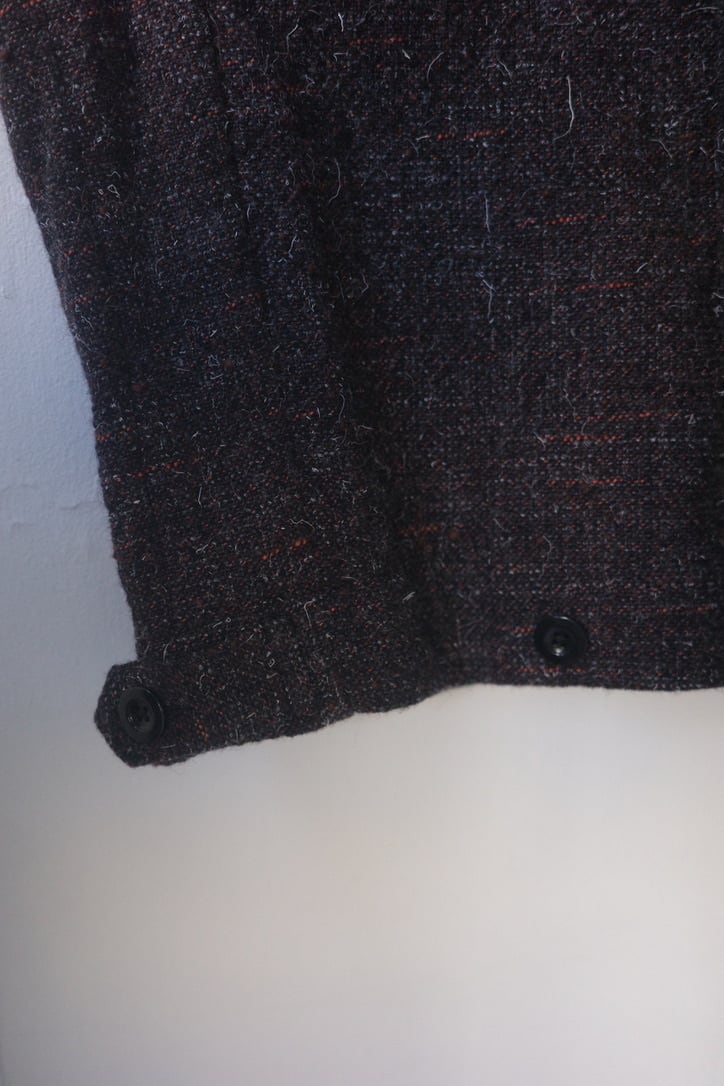 素材はツイード。ケンピ(硬く光沢のある毛)を含むツイードウールを用い、かつて試作のみで終わった生地を現代の技術で再現したKLASICAオリジナルです。糸の番手や織り密度を調整し、当時の質感を活かしながら、いまの生活に馴染む軽さと柔らかさに仕上げています。織りの奥行きと色の揺らぎが、思わず目を惹く美しいツイードです。