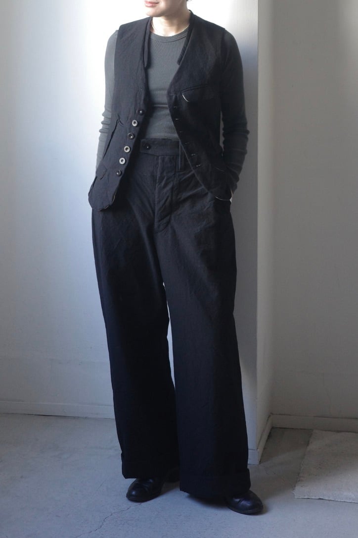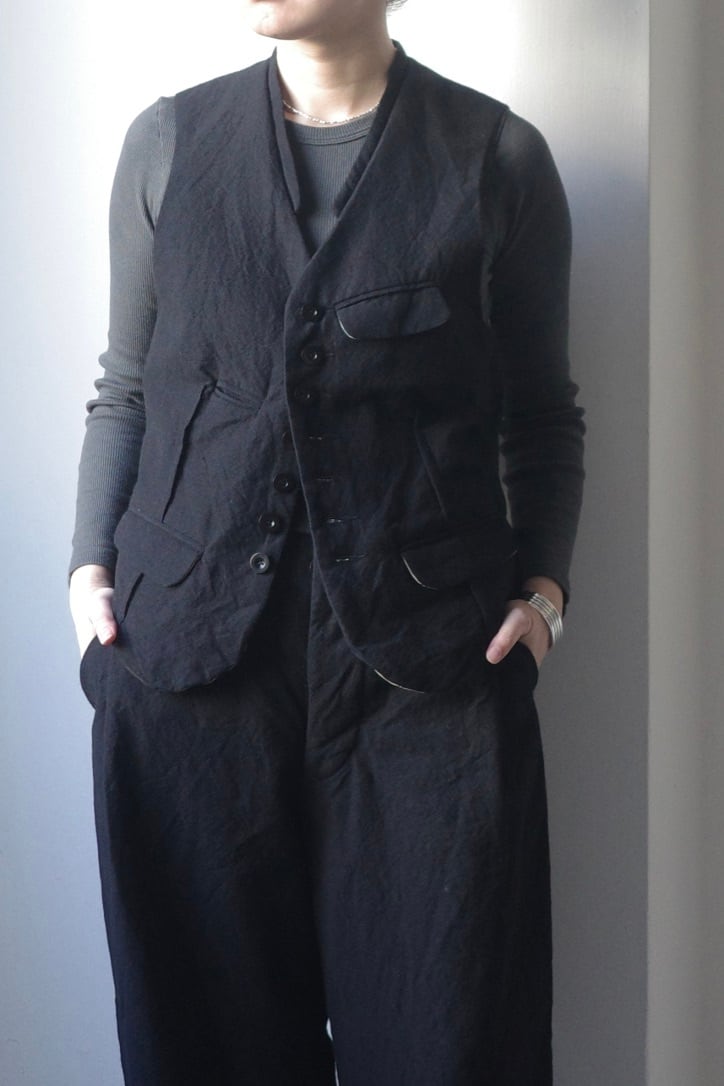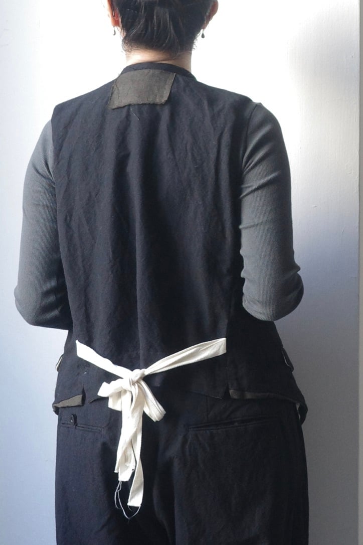 KLASICAの新作ベストは、スクエアシルエットにゆとりを持たせたデザイン。ルーズフィットで、インナーにニットを合わせてもバランスよく着ていただけます。背面のヘリンボーンテープは、絞ってフォルムを変えることも、そのまま垂らして動きを出すこともできるディテールです。