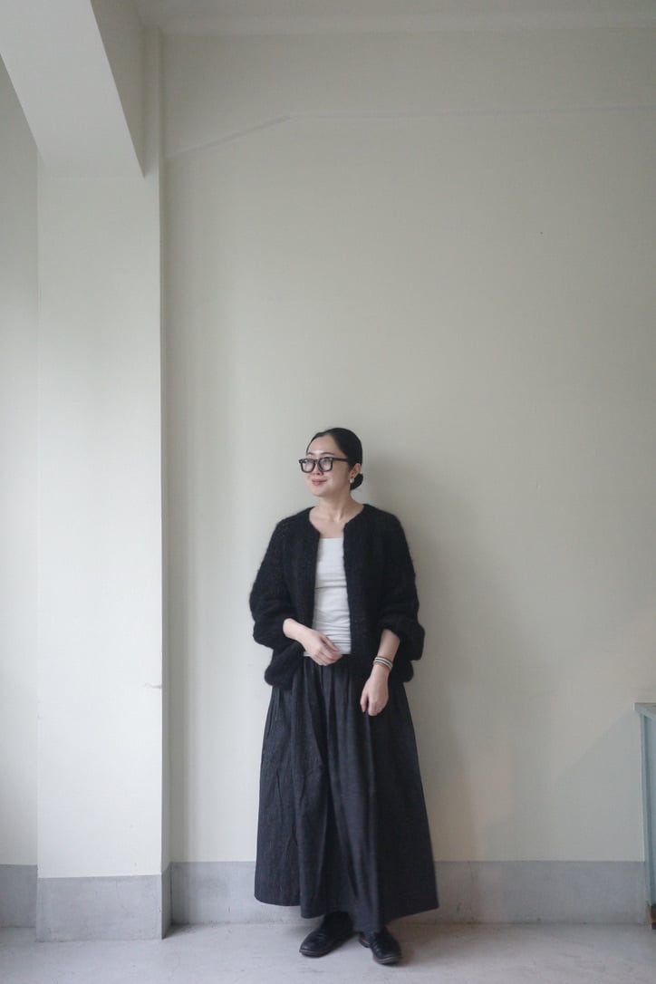 こちらは、ボタン等のないシンプルなデザインで、素材の風合いがいっそう引き立つカーディガン。ノーカラージャケットのように軽く羽織れるベーシックなシルエットです。長すぎず短すぎない程よい着丈で、どんなアイテムともバランスよく合わせられ、つい手に取ってしまう一枚。