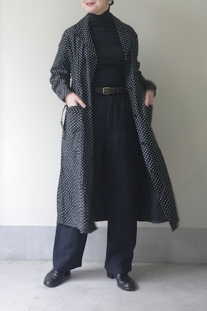 経糸にはネイビー無地のウールとトップ糸をランダムに組み合わせ、“無地に見えて無地ではない” 微細なシャドーストライプを表現。光の角度によってほのかに浮かぶ縞が、静かな存在感を放ちます。さらに、経糸と緯糸で異なる質感を掛け合わせることで、生地の表面にはわずかな凹凸が生まれ、微細な色調の揺らぎが、素材そのものの存在感を際立たせます。