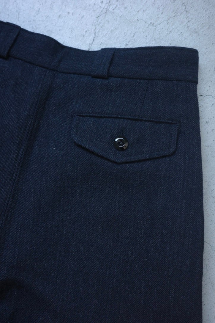 デザインのベースは1950年代〜約10年にわたりフランス軍で採用されたチノトラウザー。タックの入った太めの足周りから裾に向かってテーパードがかかっており、上品なシルエットに仕上っております。深い股上はすっぽりと包み込む安心感、太めのながらもヒップ周りはシャープで美しいシルエットなのです。