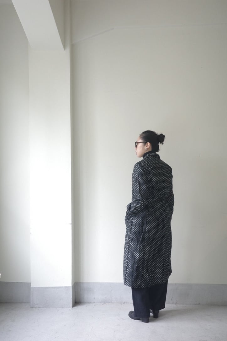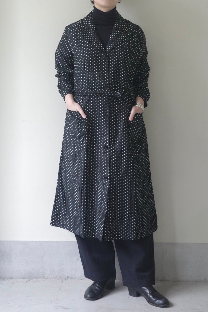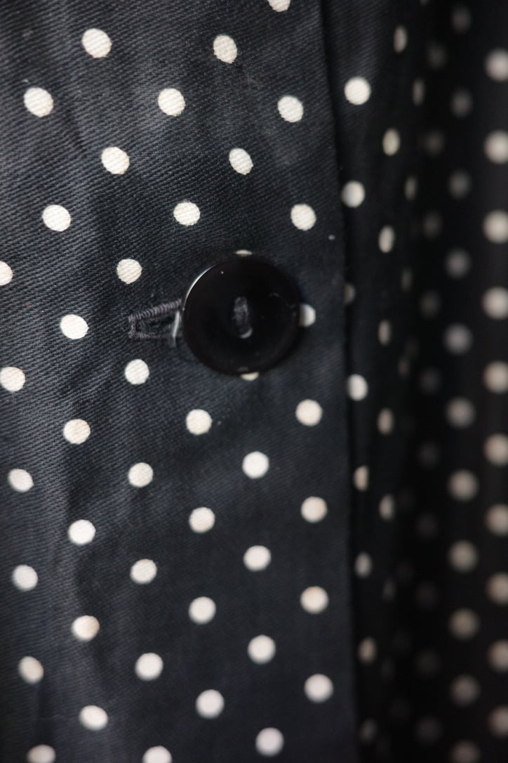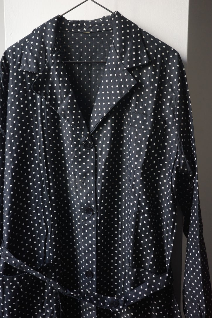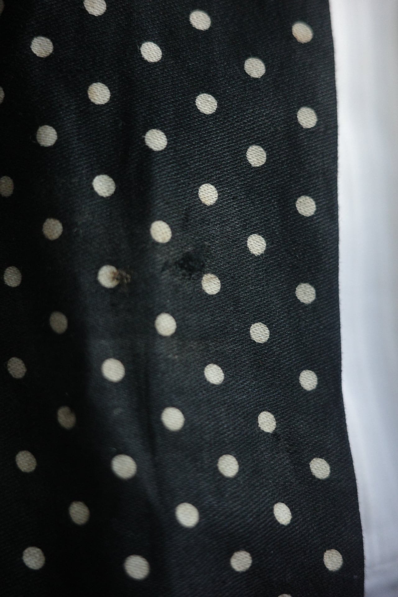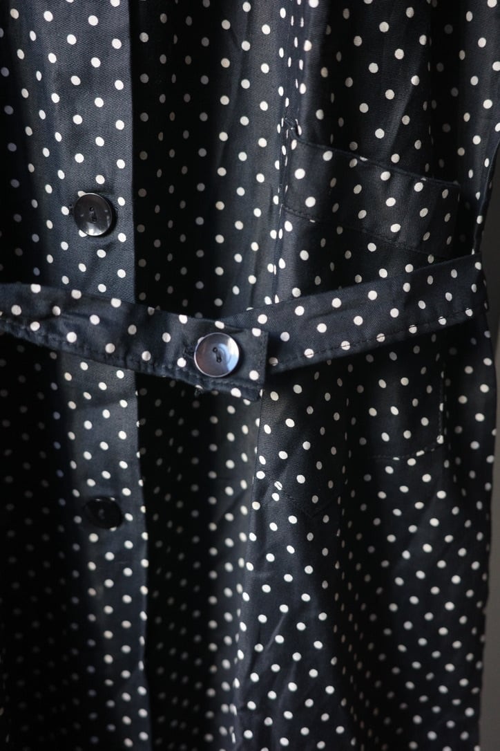 推定1950年代頃のフランスのワークドレス。ブラックを基調に、真っ白ではなくほんのりベージュを含んだドット柄が散りばめられています。1枚で着用できるくらい着丈もしっかりとあって、可愛らしさよりも“大人の上品さ”が際立つ一着だと思います。