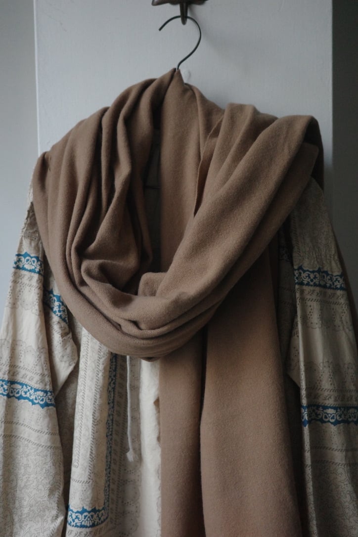 こちらのストールは、カシミアをブレンドした上質な一本です。もっちりと滑らかな質感は、まさに極上の肌触り。ひと巻きするだけで、素材の上質さが際立ちます。