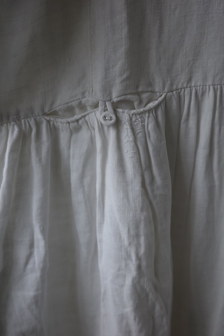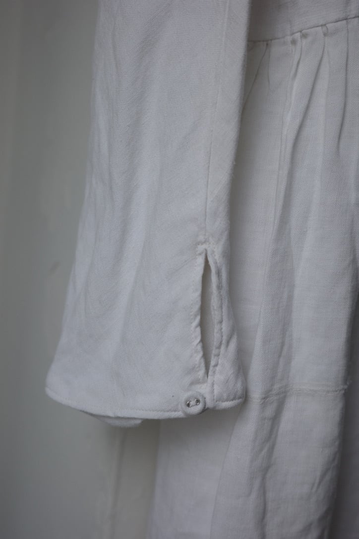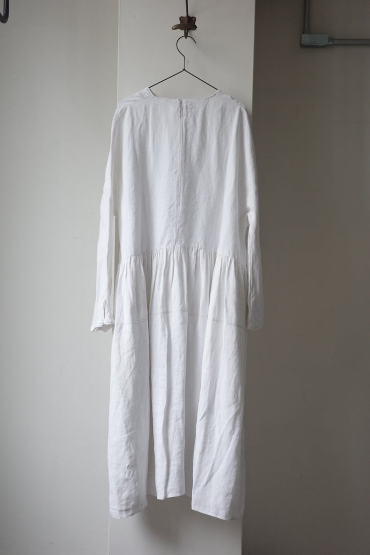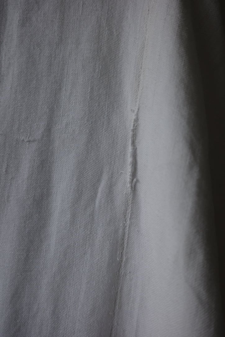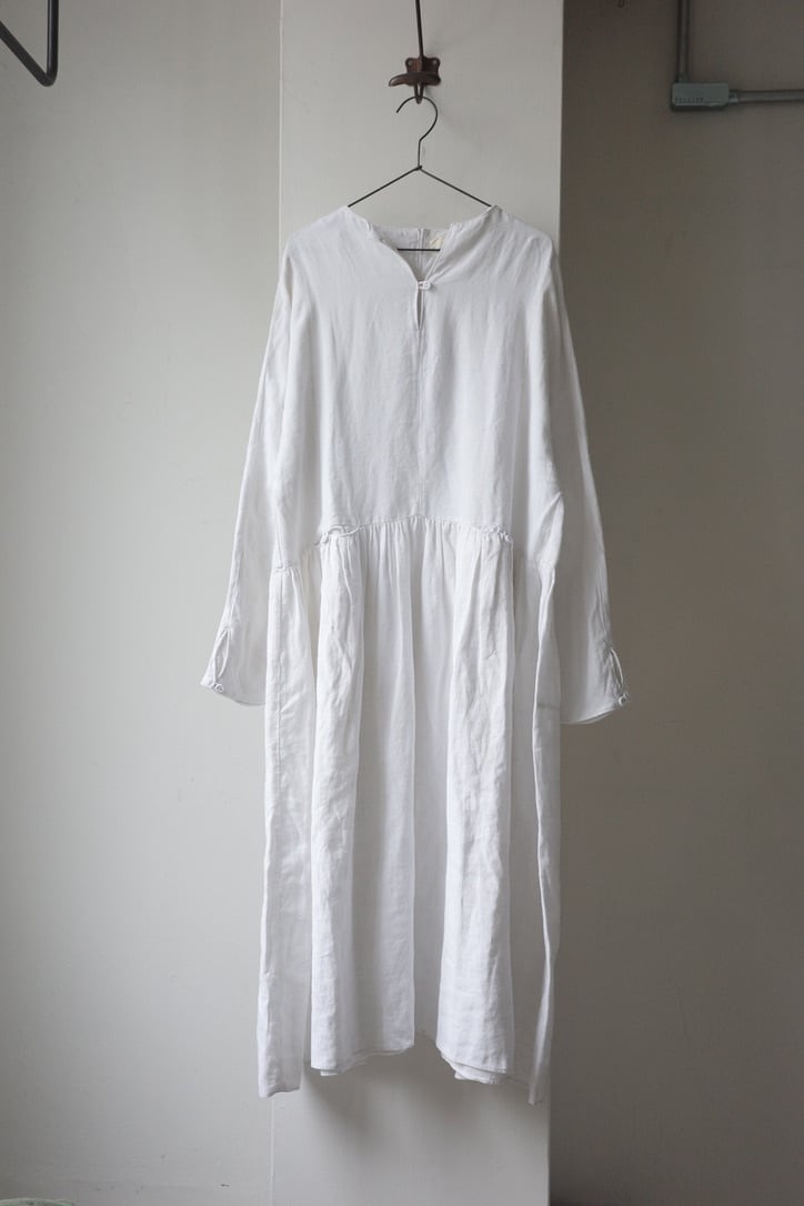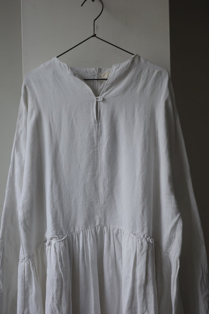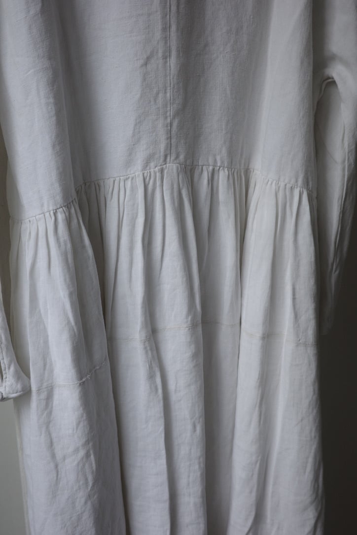 こちらは、アンティークリネンを贅沢に使用したドレス。手紡ぎ手織りによって仕立てられた、所々に見られるポコポコとしたネップ、不均一なリネンの風合いは表情豊か。時を経て雰囲気を増した”当時だからこそ”の風合いの良さは、最大の魅力だと思います。墨黒とまでも言いませんが、後染めによるブラックの色味も素敵です。