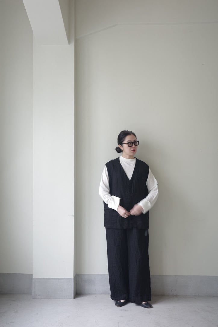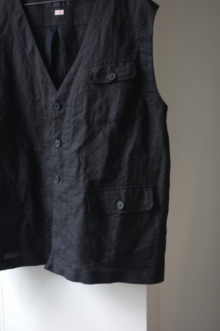 KLASICA 26SS Collectionより届いた、ワークウェアスタイルのベスト。オーバーベストとしてざっくりと羽織りやすいサイジングです。Vネックのすっきりとした首元に、フロントと内側に配された複数のポケットが、さりげないアクセントに。