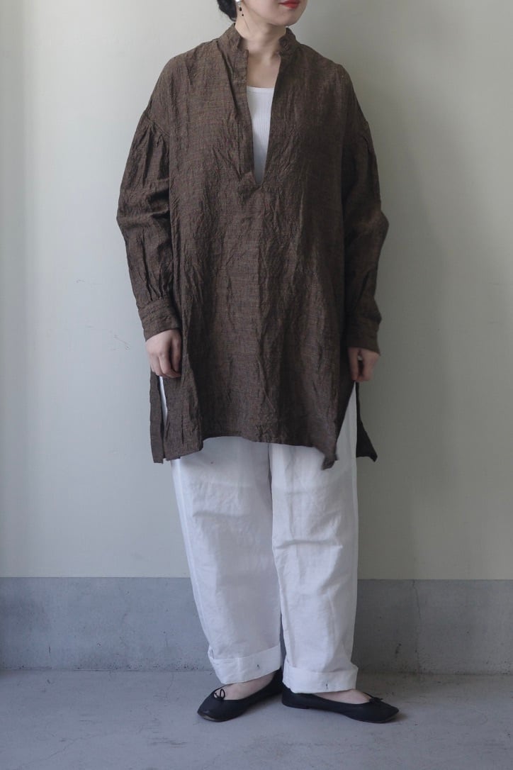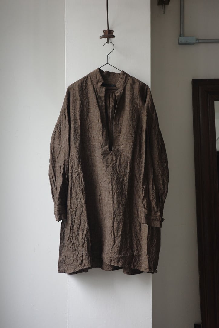 ゆったりとしたリラックスフィットのプルオーバーシャツ。スクエアカットの裾や、ヴィンテージのようなネックラインがさりげないアクセントになっています。モダンな感覚とアンティークの空気を織り交ぜた、どこか懐かしさの漂うデザイン。