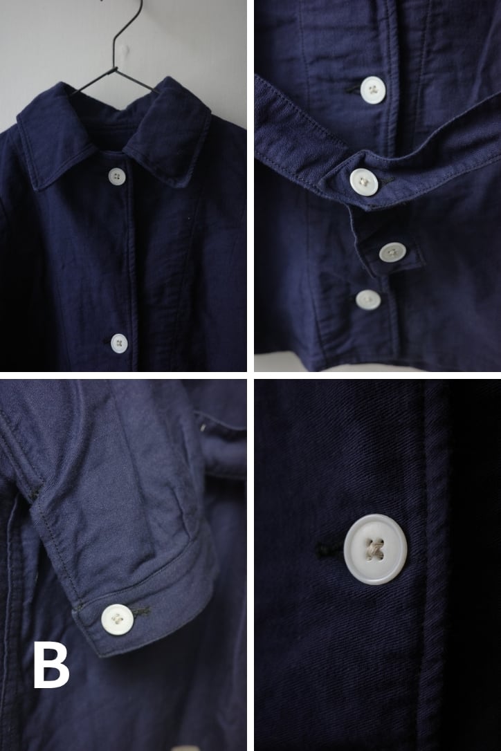 生地には、古き良き英国のワークウェアに見られるコットンドリルを使用。ガシッとした糸の密度からは、しっかりとした無骨さが感じられます。ロイヤルネイビーならではの、濃紺〜茄子紺の深みのある色合いも、このジャケットの大きな魅力です。