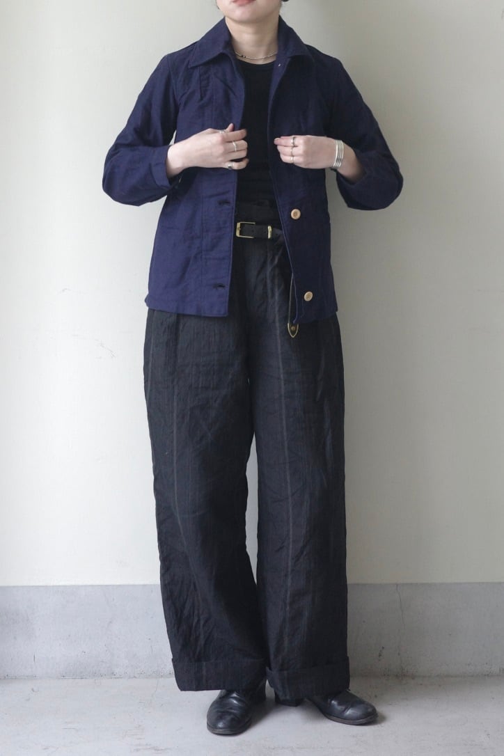 生地には、古き良き英国のワークウェアに見られるコットンドリルを使用。ガシッとした糸の密度からは、しっかりとした無骨さが感じられます。ロイヤルネイビーならではの、濃紺〜茄子紺の深みのある色合いも、このジャケットの大きな魅力です。