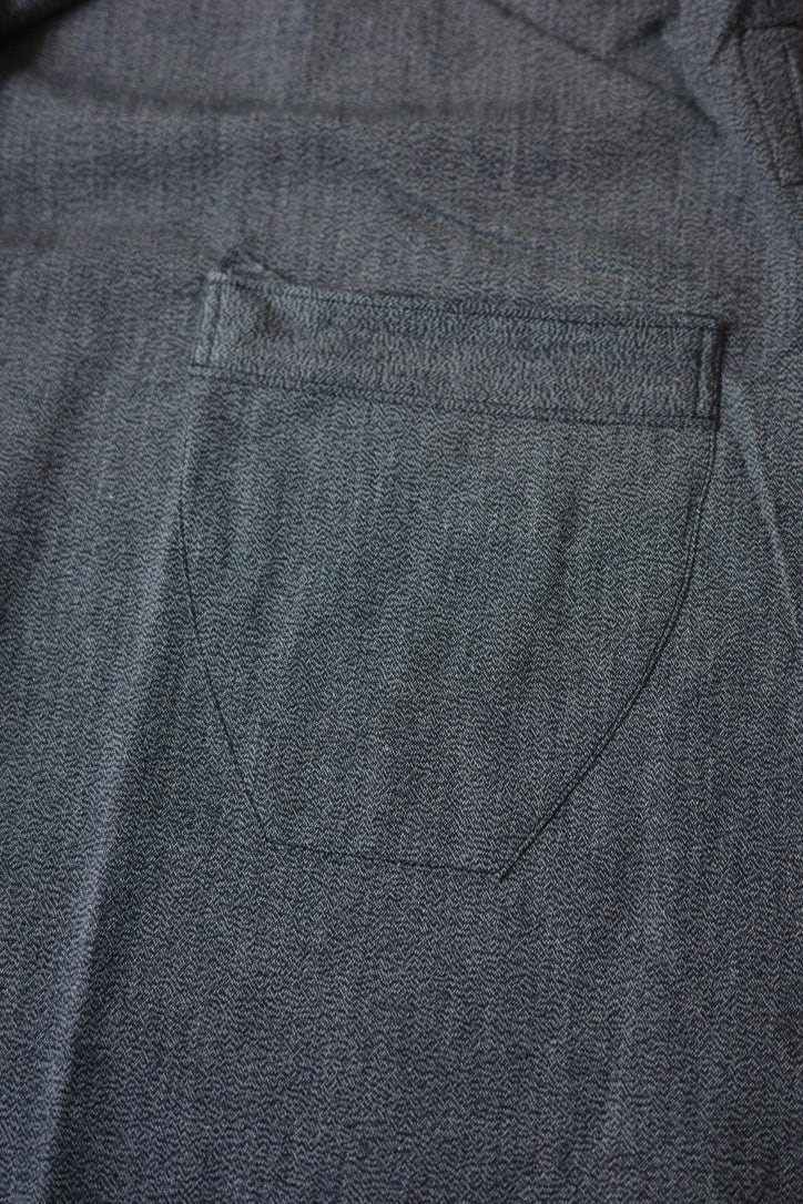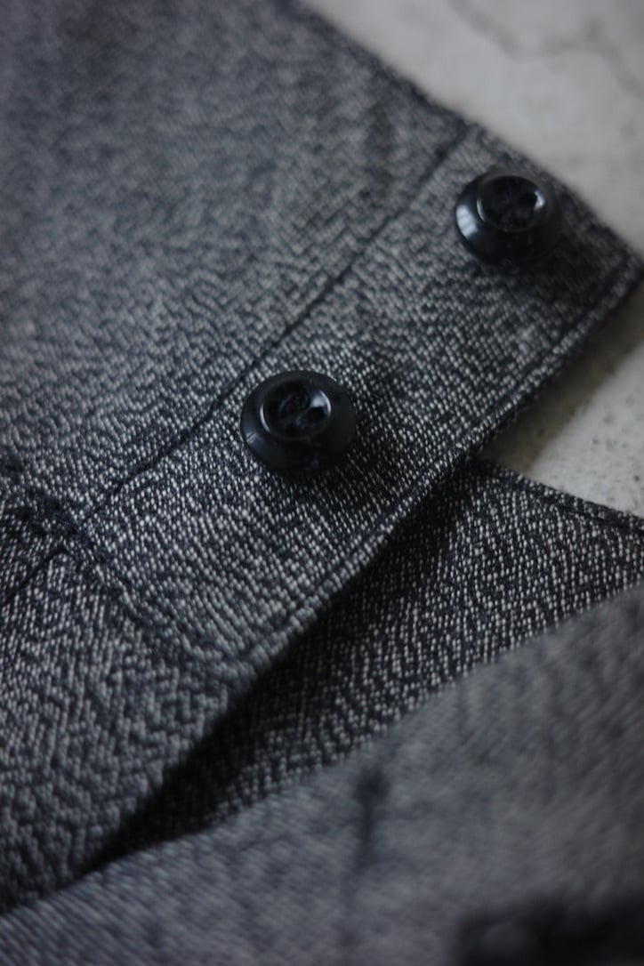 生地には、日本の力織機で織り上げたブラックシャンブレーを採用。撚り杢糸による霜降りのような表情と、奥行きのある色合いが特徴です。ワークウェア由来の素材でありながら、軽やかでどこか繊細さも感じられる仕上がり。