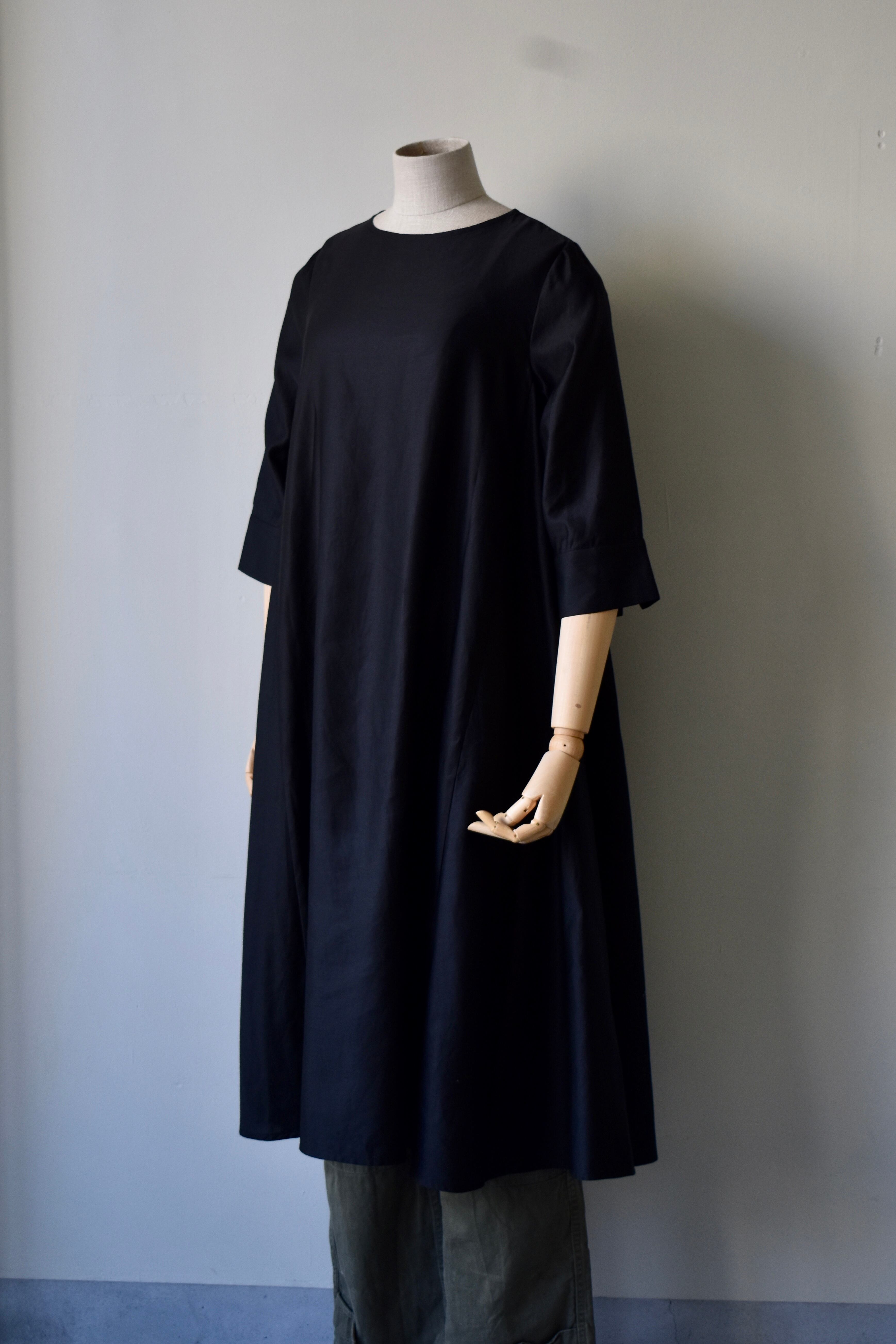 Vintageのナイトドレスを元にシンプルで女性らしいドレスに。3枚のパターンを縫い合わせたことで生まれる、流れるようなAラインがポイント。全体的にはすっきり、裾にかけてたっぷり広がり、丈も長めで落ち着いた印象です。開閉は大きく開いた涙型ボタン。素肌を覗かせても、インナーで重ね着を楽しむのもオススメです。