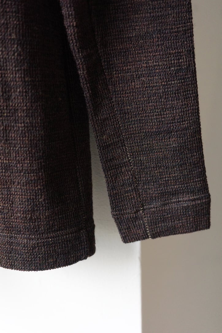 生地はジャガード編機によるウールジャージー。トップ染めの糸と、防縮糸を掛け合わせ凹凸感を作り、ウール特有のチクチク感を軽減させております。また、見た目では分からないのですが、実は千鳥格子柄なのです。自分にしかわからない特別感を秘めた、KLASICAらしい拘りを感じる素材です。