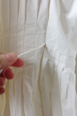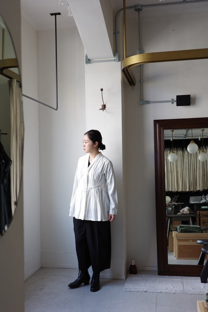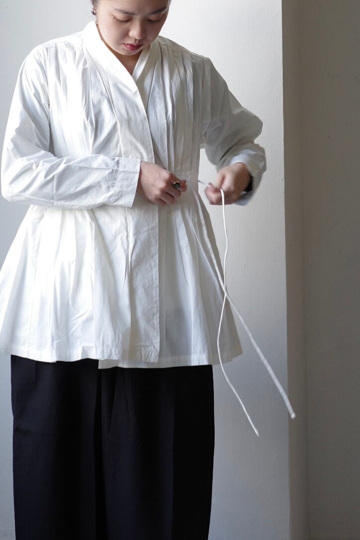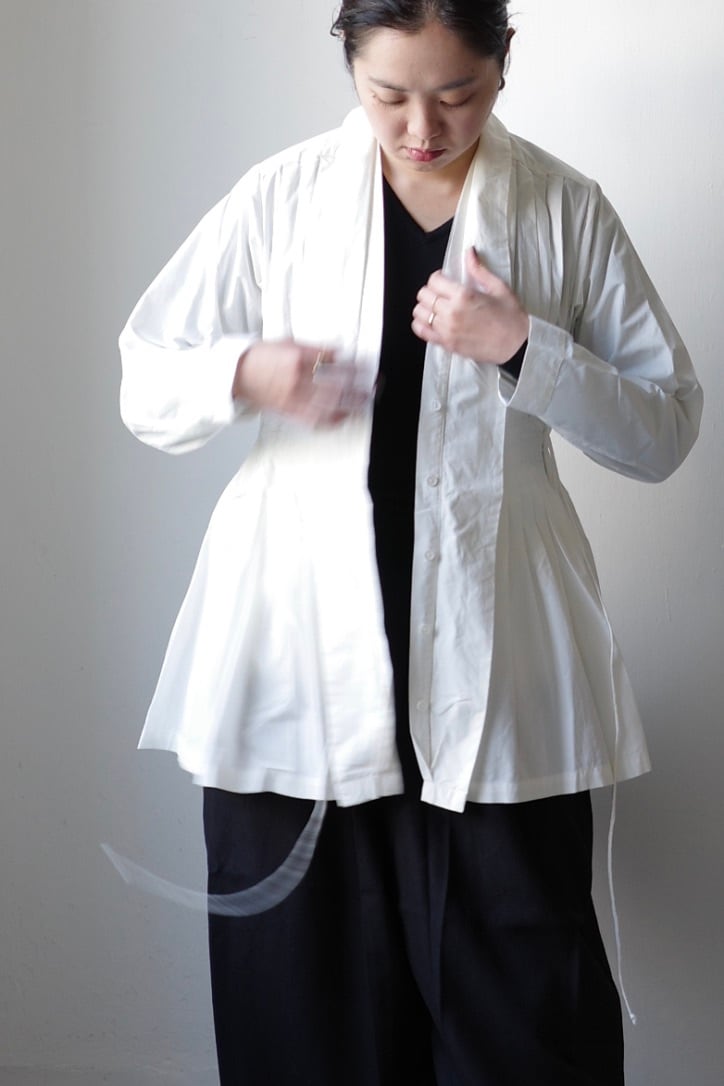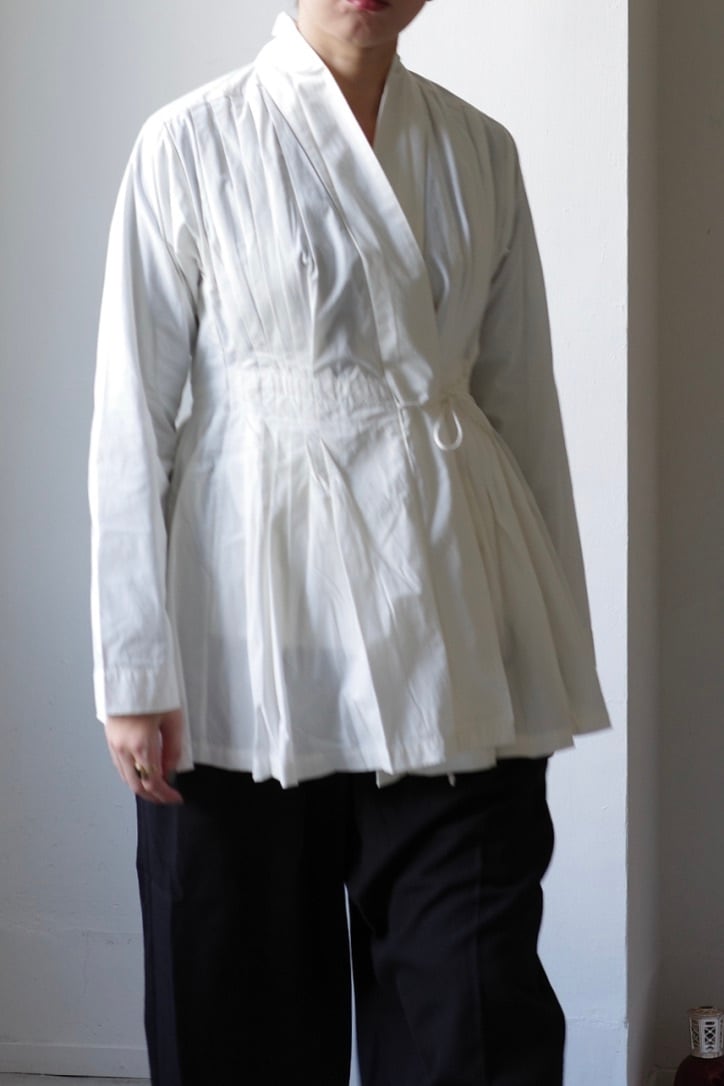 たっぷりと贅沢に施されたプリーツにうっとりとするこちらのブラウス。生地をふんだんに使用しながらも、身体に添う美しいシルエットです。首元はショールカラーになっており、その内側からボタンが見え隠れします。左右ウエストに付いたリボンを結ぶと、カシュクールのようなデザインに。生地は適度な肉感とハリ、光沢が上品なコットンプポリンです。