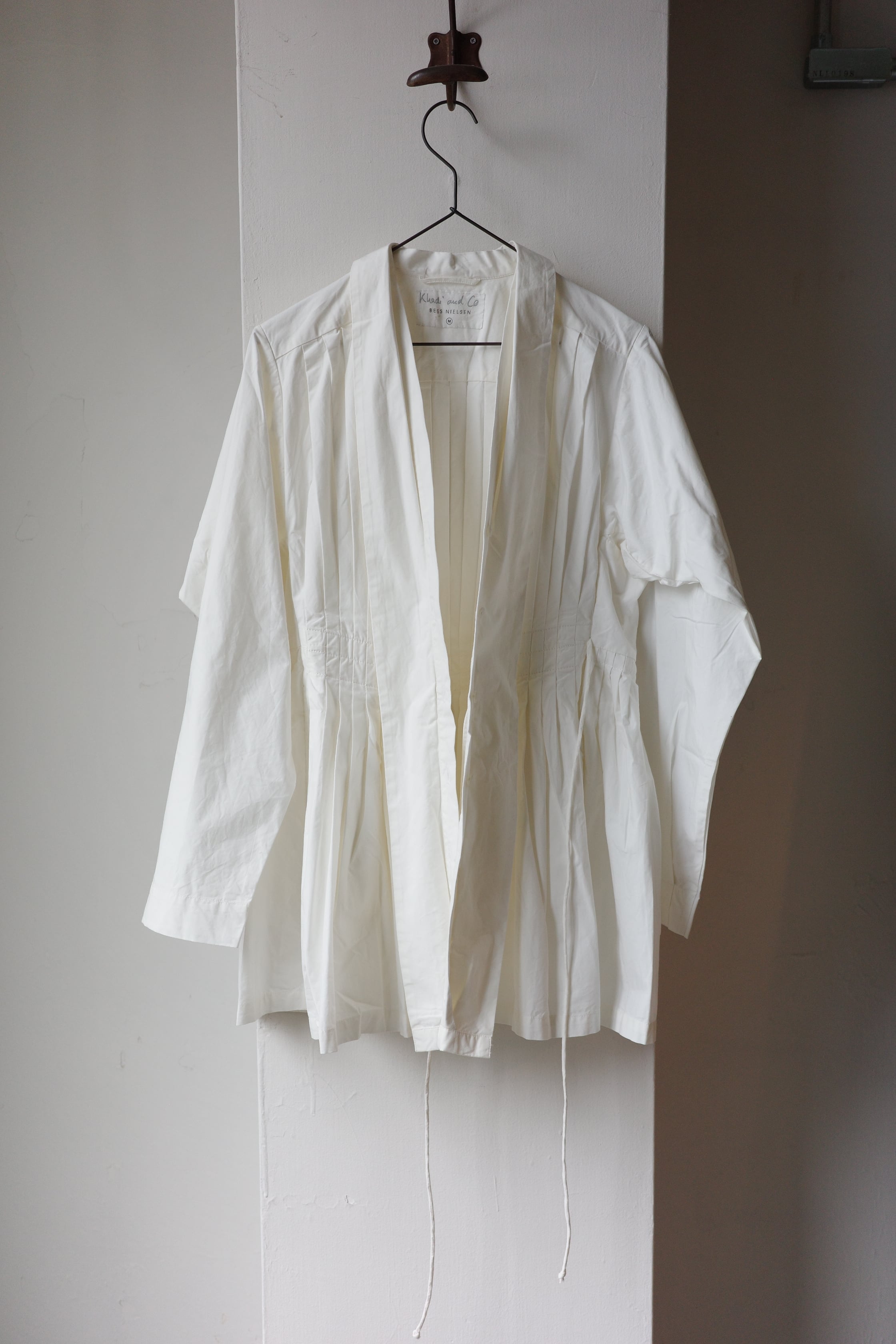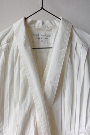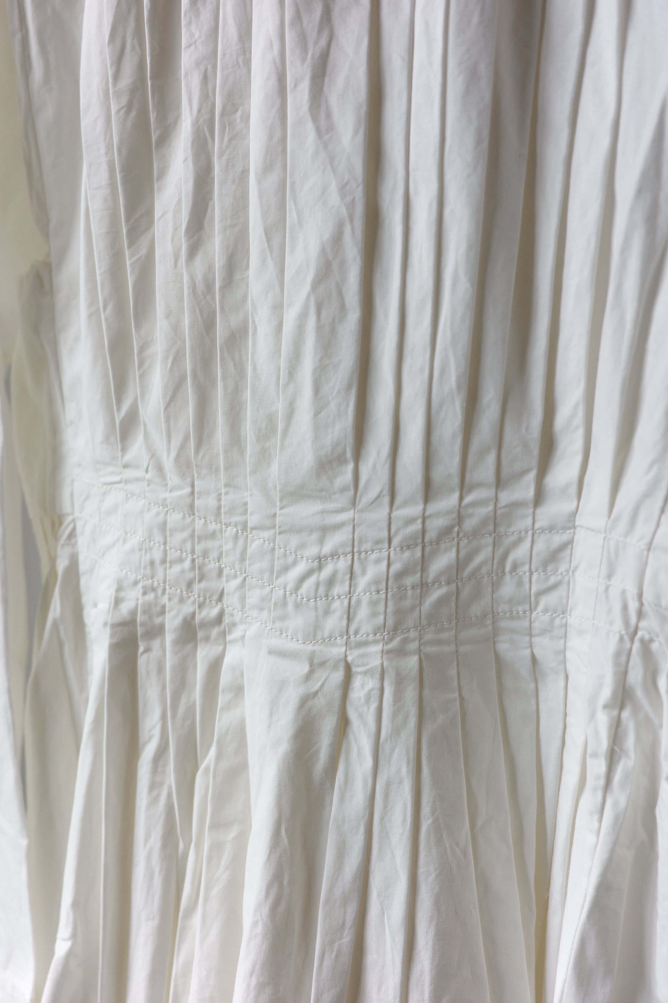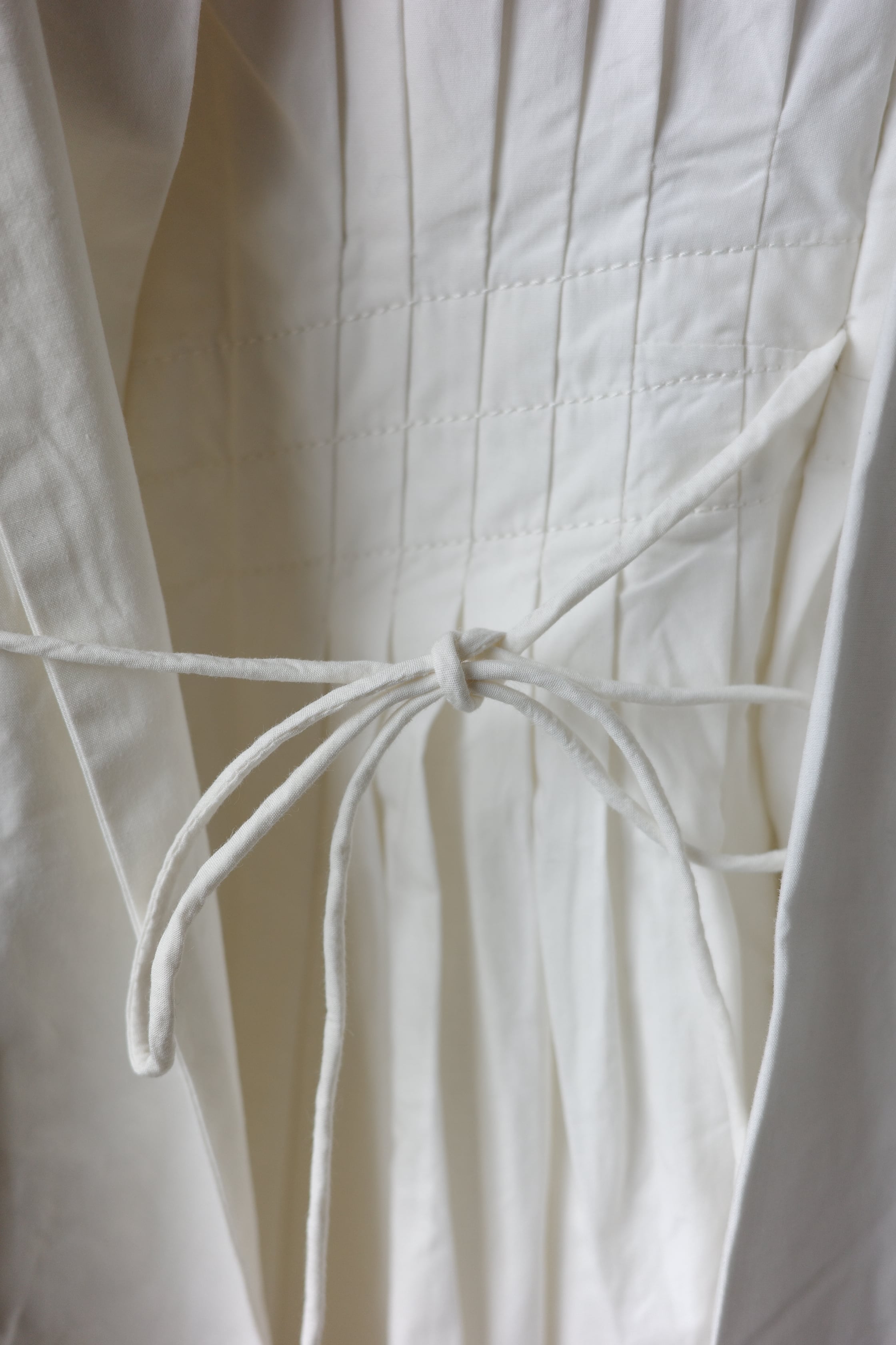 たっぷりと贅沢に施されたプリーツにうっとりとするこちらのブラウス。生地をふんだんに使用しながらも、身体に添う美しいシルエットです。首元はショールカラーになっており、その内側からボタンが見え隠れします。左右ウエストに付いたリボンを結ぶと、カシュクールのようなデザインに。生地は適度な肉感とハリ、光沢が上品なコットンプポリンです。