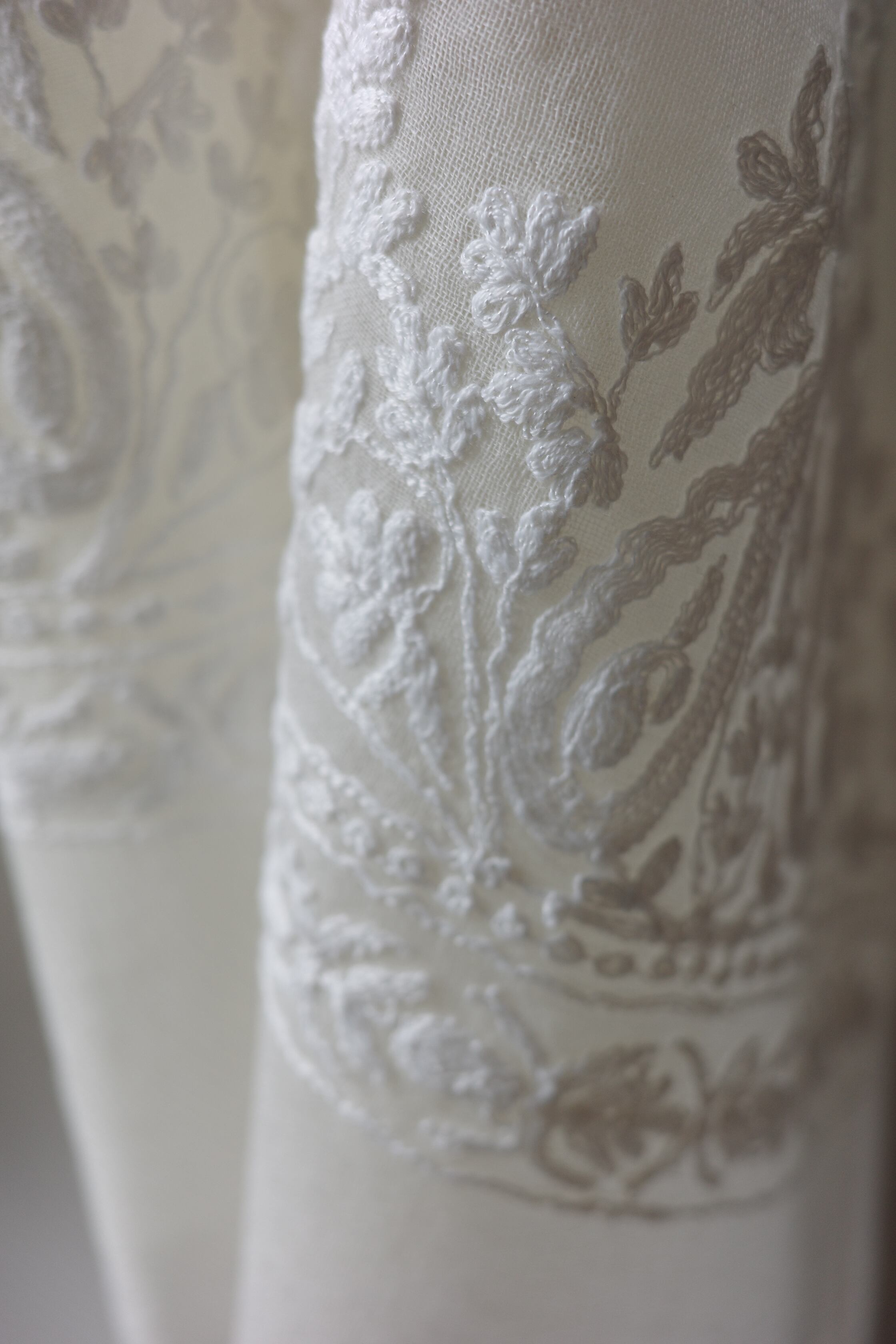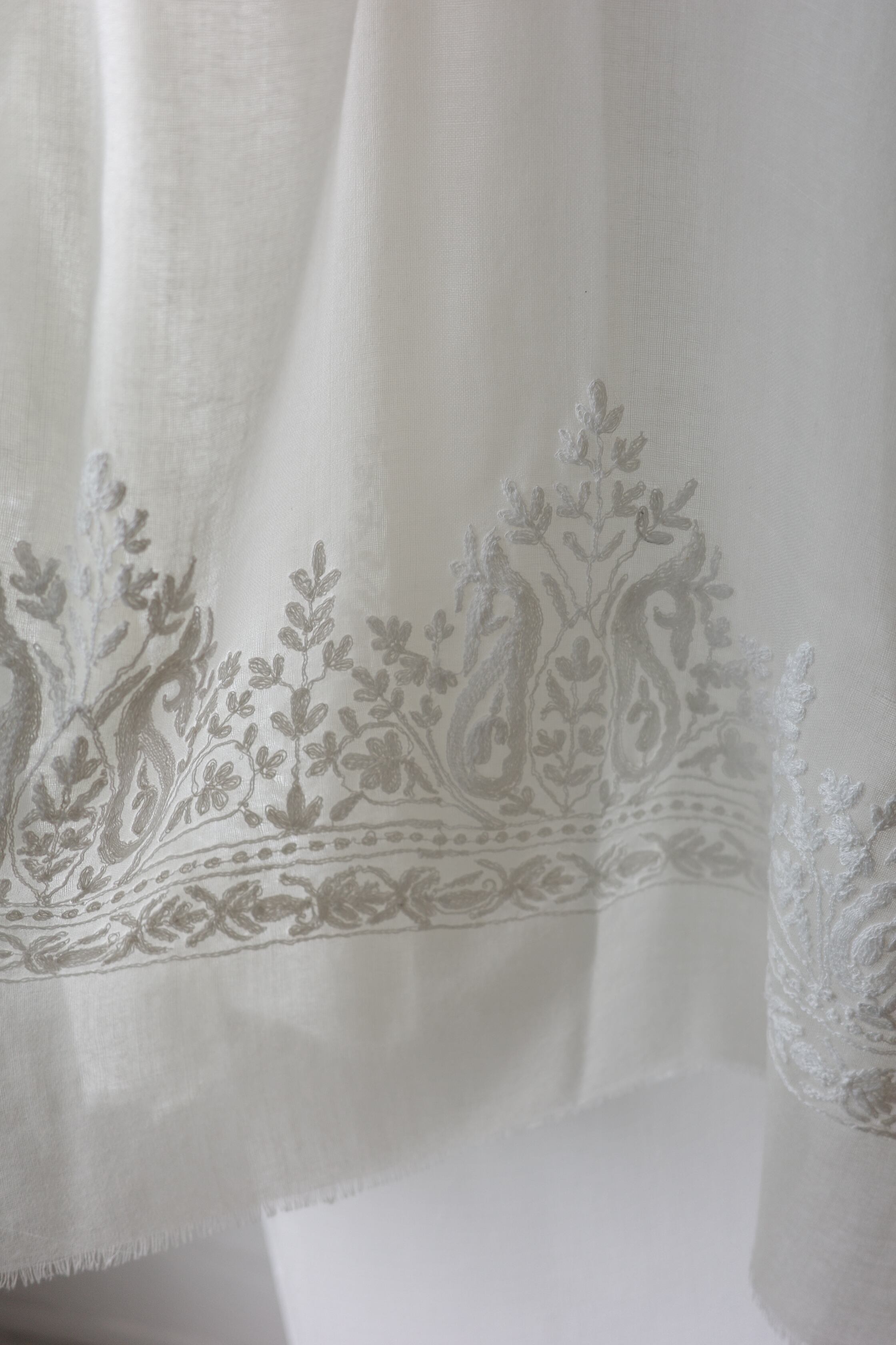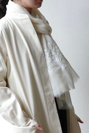 立体的にデザインされた手刺繍のストール。極細のウールを手織りしており、ガーゼのような透け感のある繊細な仕上がりです。刺繍は両裾に施されているので、巻き方で無地の分量を調整しアレンジしてください。まるでアンティークレースのような雰囲気漂うストールです。