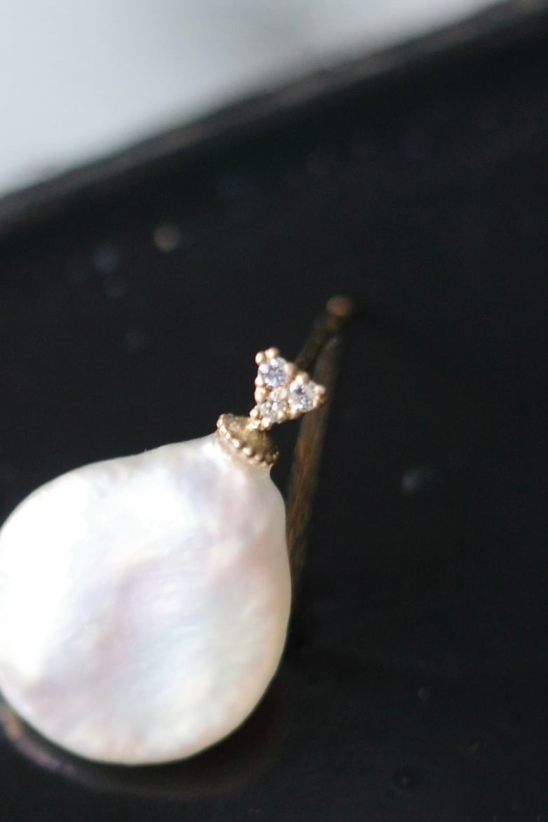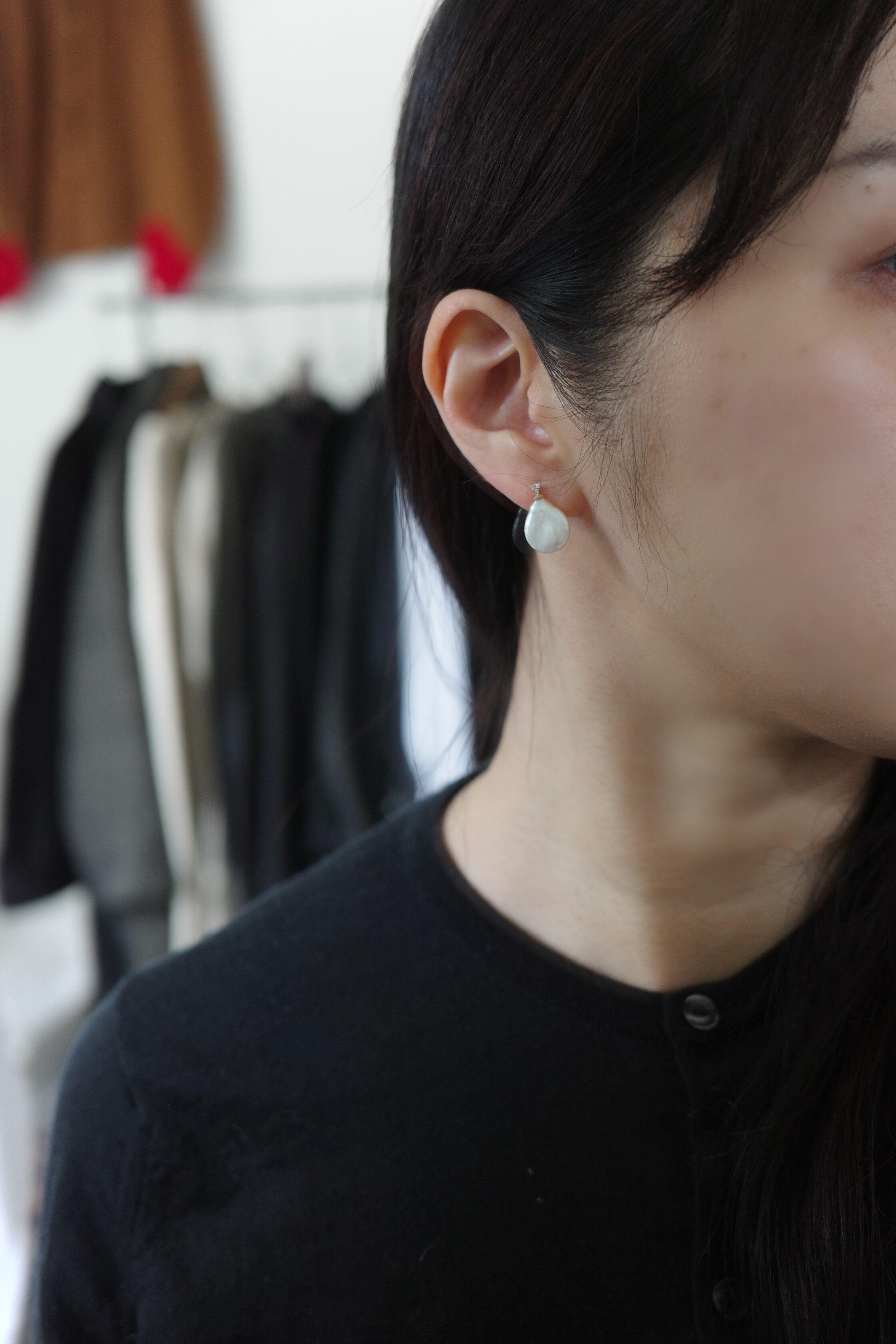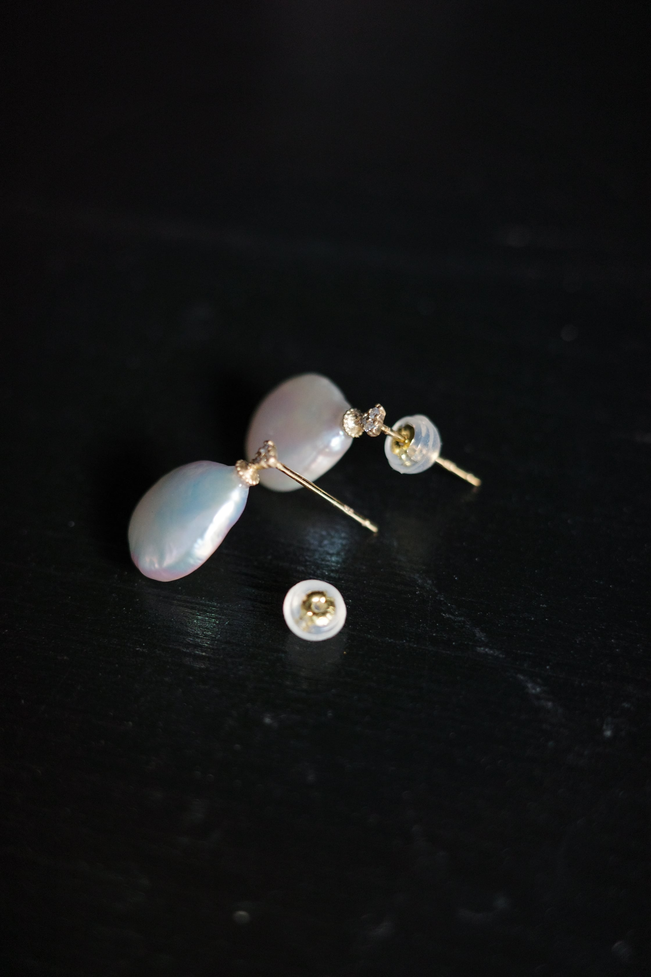 アメリカのテネシー河で育った輝りが美しいナチュラルパール。自然の色、その瑞々しい輝きは他にない上質な空気感を持っています。一般的なパールはコロンとしたものがイメージですが、こちらは平たくて耳元にぺたんと吸い付くような形。そしてパールの上部には小さなダイヤモンド。角度によってとても美しく輝きます。