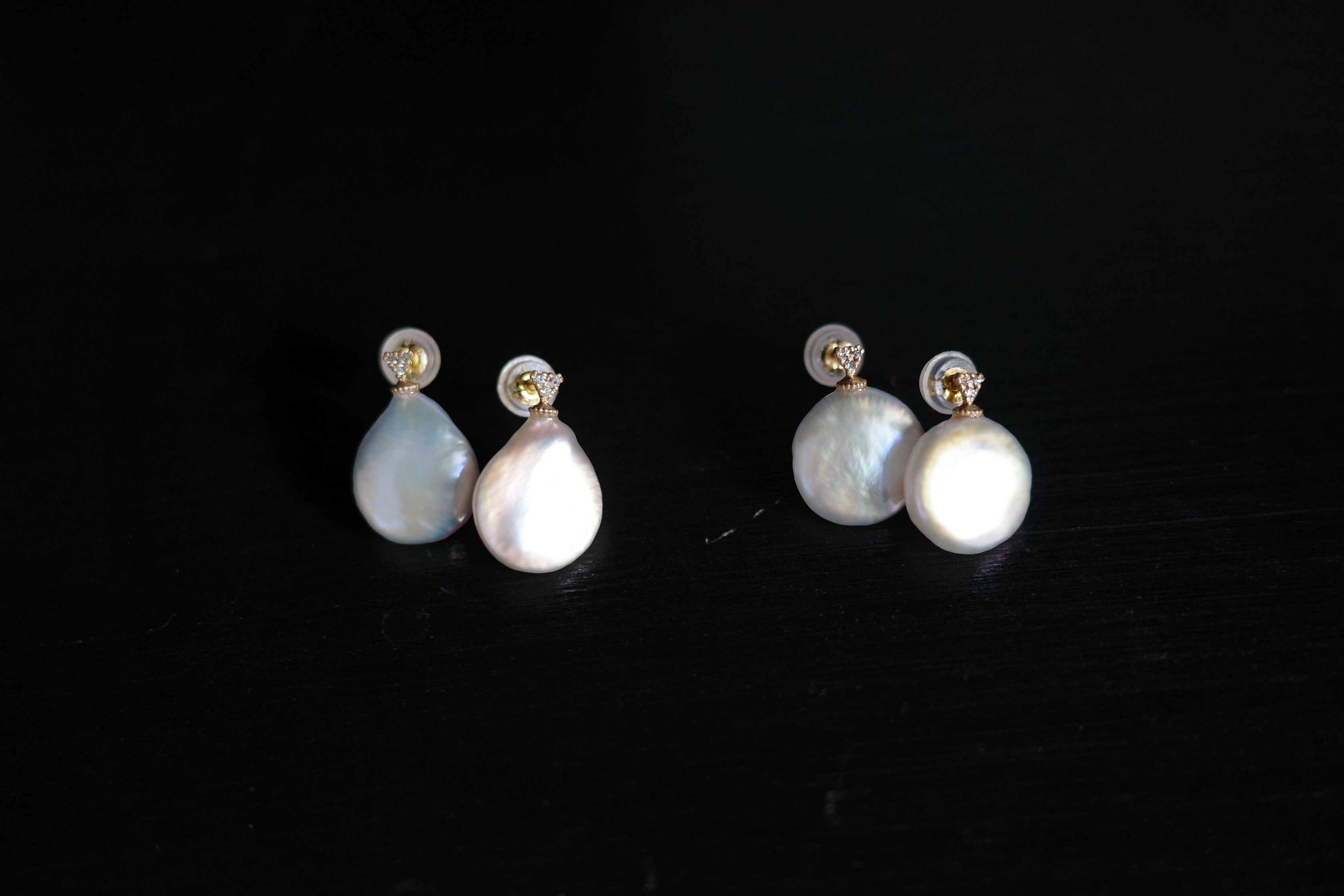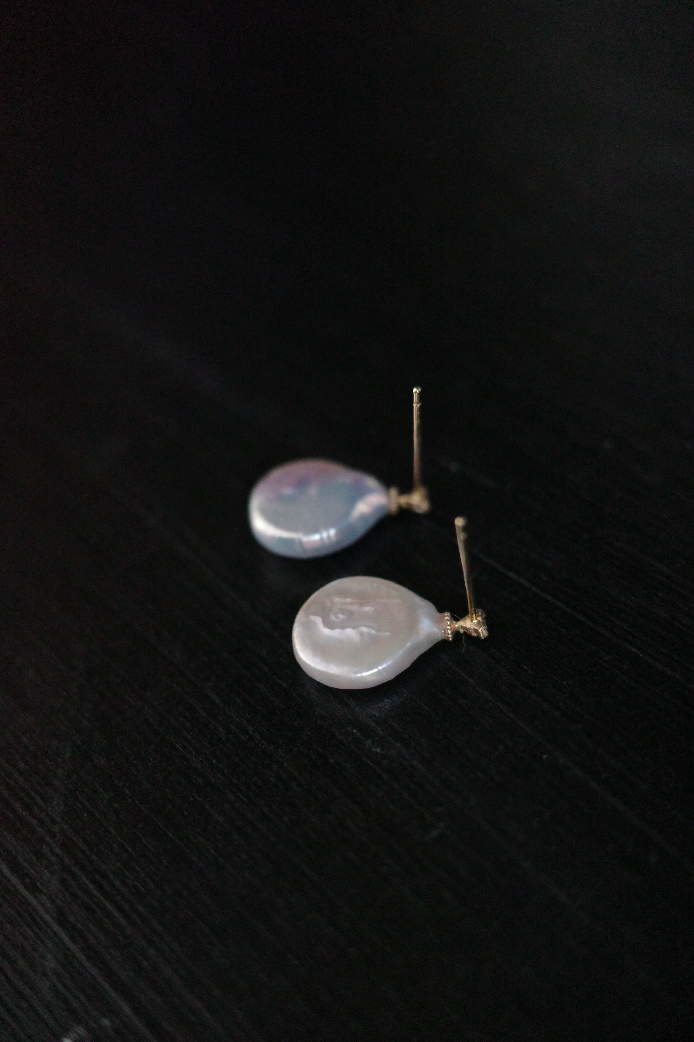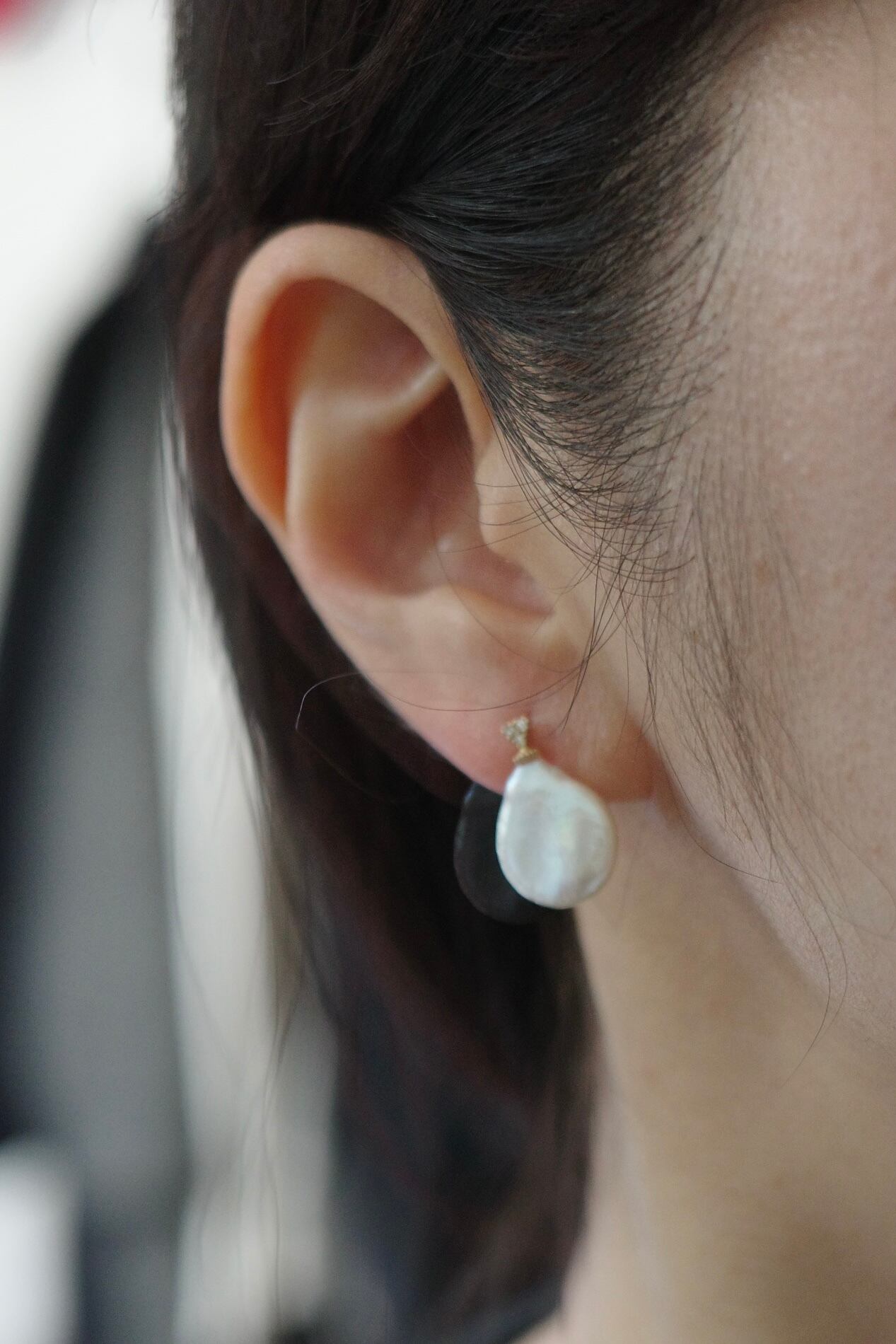 アメリカのテネシー河で育った輝りが美しいナチュラルパール。自然の色、その瑞々しい輝きは他にない上質な空気感を持っています。一般的なパールはコロンとしたものがイメージですが、こちらは平たくて耳元にぺたんと吸い付くような形。そしてパールの上部には小さなダイヤモンド。角度によってとても美しく輝きます。