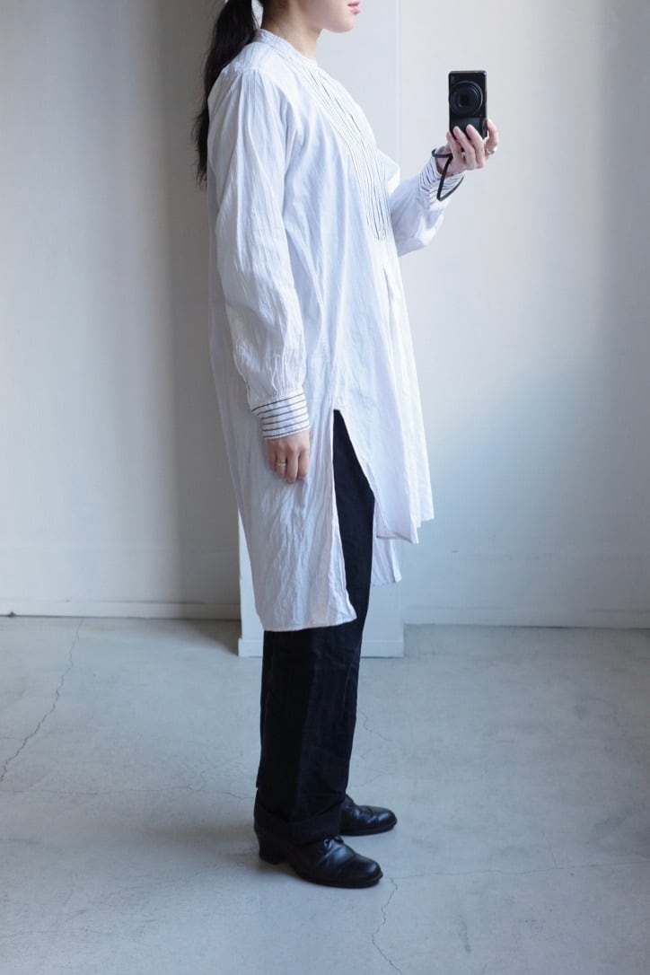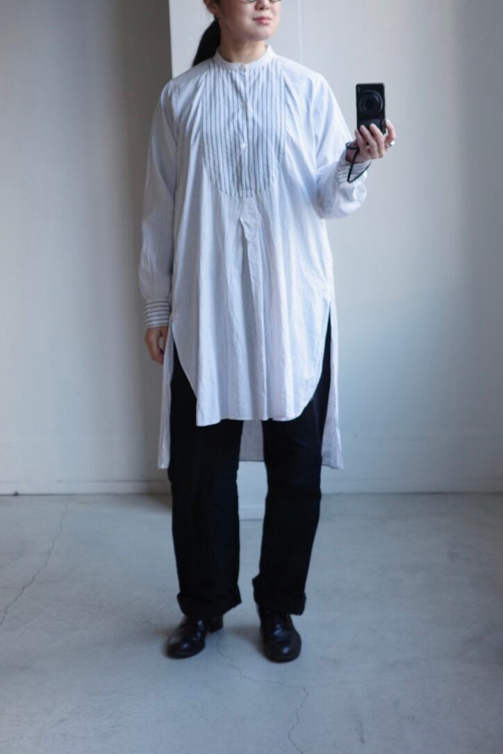 元々は”メンズ”のドレスシャツとして仕立てられたもので特徴的な着丈の長さは、パンツにインするためにこのような長さにデザインされていました。この着丈の長さを活かした着こなしを楽しめるのは女性ならでは、そして現代だからこそだと思うのです。仕立ての良さを感じる作りは、シンプルな着こなしがとても格好良く映えるので、パンツにさらりと合わせるのも◉前後差のある深いスリットはスカートとの合わせも素敵です。