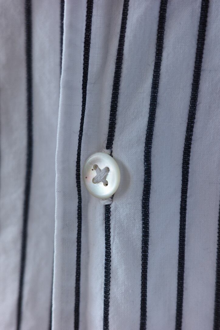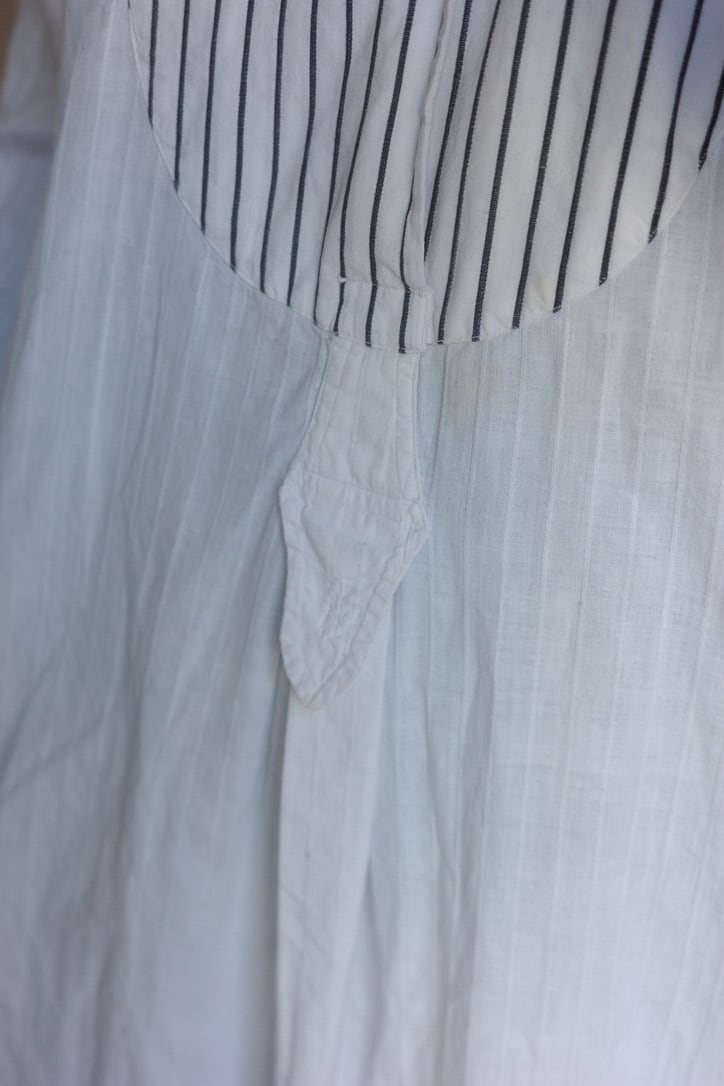 1865年に創立したパリの老舗デパート" AU PRINTEMPS PARIS " のドレスシャツで、仕立ての良さはお墨付き。胸元とカフスのストライプ使いが目を引く一枚です。肩幅40㎝と女性が着るのにとても良いサイズ感。薄いシミあり(最後の2枚画像をご確認ください)