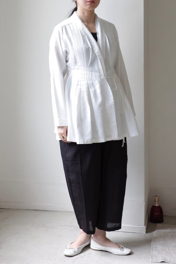 素材はカディコットン。手紡ぎ手織り、全て手仕事から生まれる贅沢な生地です。4本どりでしっかりと織り上げられた凹凸のある表情が魅力。程よく厚みがあり、しっとりとした質感です。