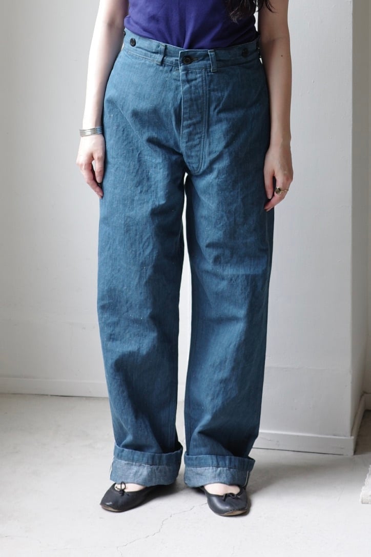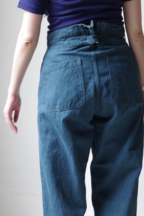 デザインは1930年代フランス海軍の作業用トラウザーがベース。腰回りをすっぽりと包み、ストンと落ちるシルエット。程よいゆとりのある太さです。クラシックな雰囲気を彷彿とさせるサスペンダーボタン、シンチバックの付くハイバック仕様の後ろ姿など、一般的な5ポケットデニムとはまた一味違う、OUTILらしいデニムではないでしょうか。