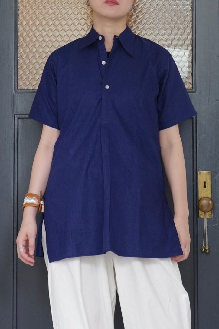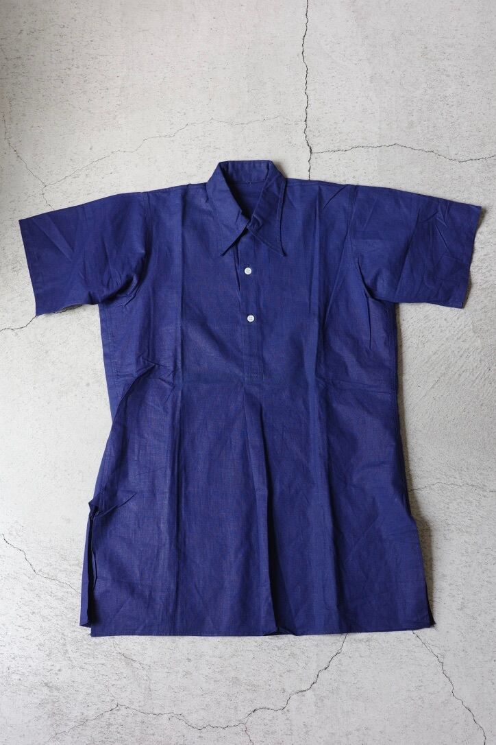 推定1940〜50年代、フランスのワークシャツです。デッドストック(未使用)の状態で入荷致しました。プルオーバーで、すっきりとしたシルエット。美しいブルーとヴィンテージならではの風合い豊かな生地魅力。シンプルながらも存在感のあるシャツです。