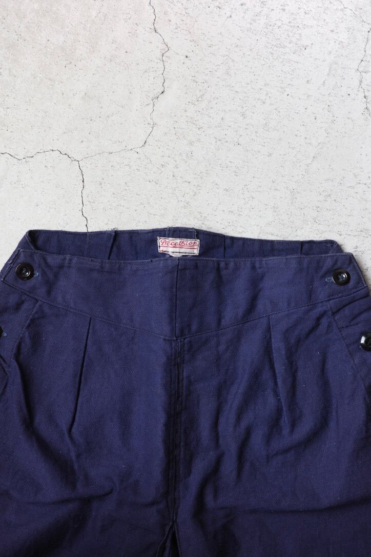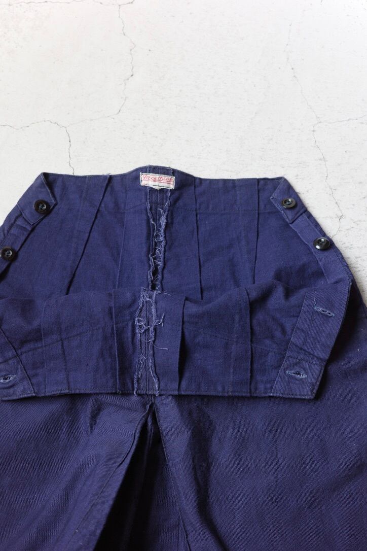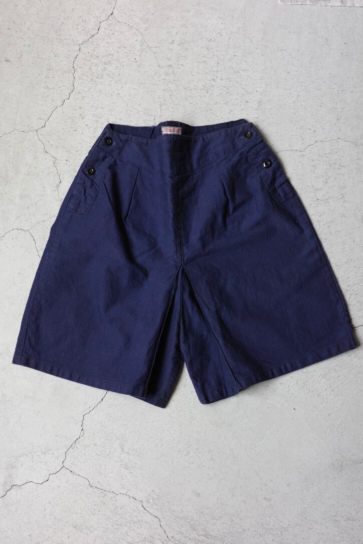 推定1960年代、イギリスのショートパンツです。セーラーパンツのように両サイドのラッカーボタンをパタンと開閉して履く形。股下にタックが入る2重の作りとなっており、キュロットスカートのようなシルエットです。