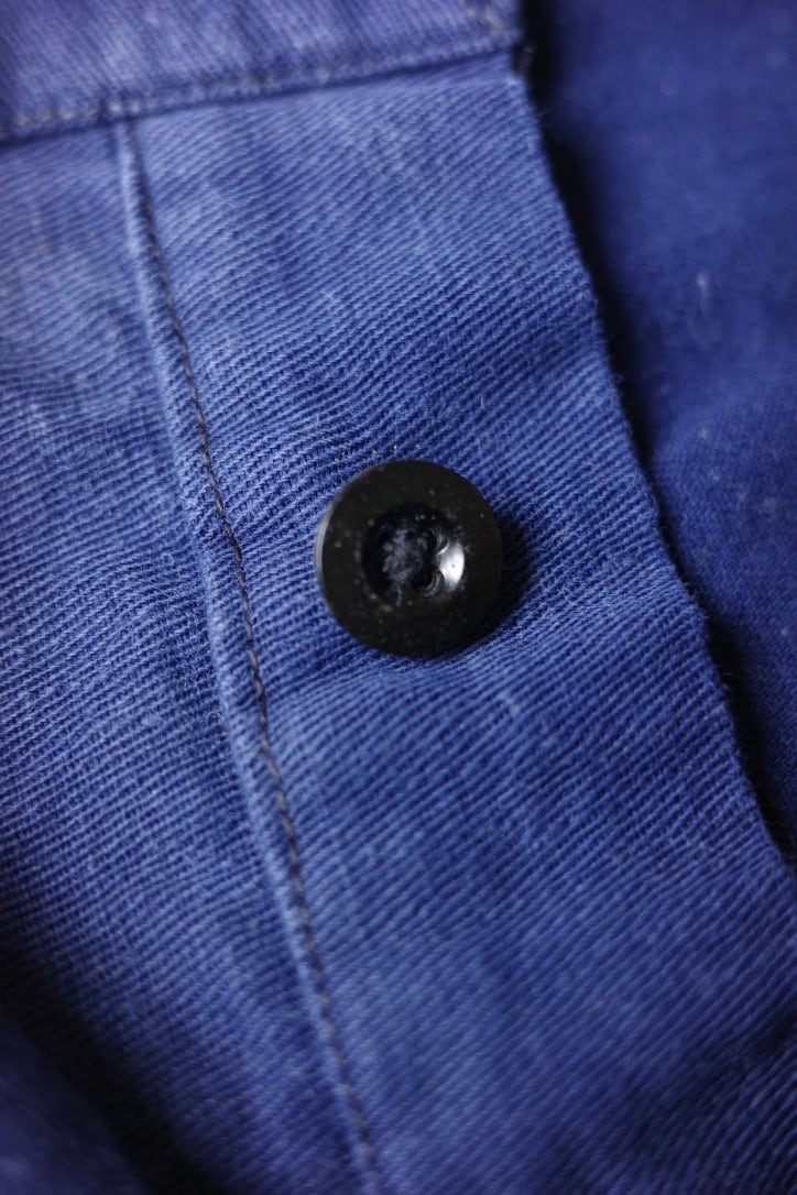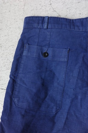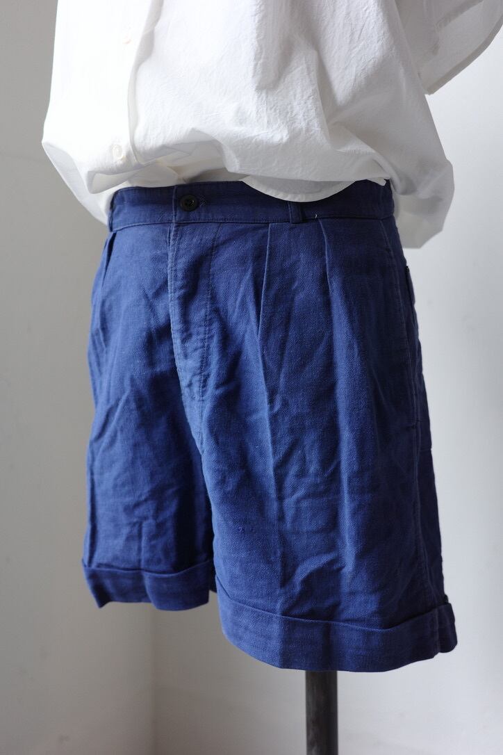 推定1950年代、フランスのショートパンツです。フロント両サイドに2タック、ダブルの裾仕様。癖のないシンプルなシルエットなので、合わせるものを選ばない万能ショーツだと思います。ネイビーが色落ちした経年変化、風合い豊かな生地が魅力。