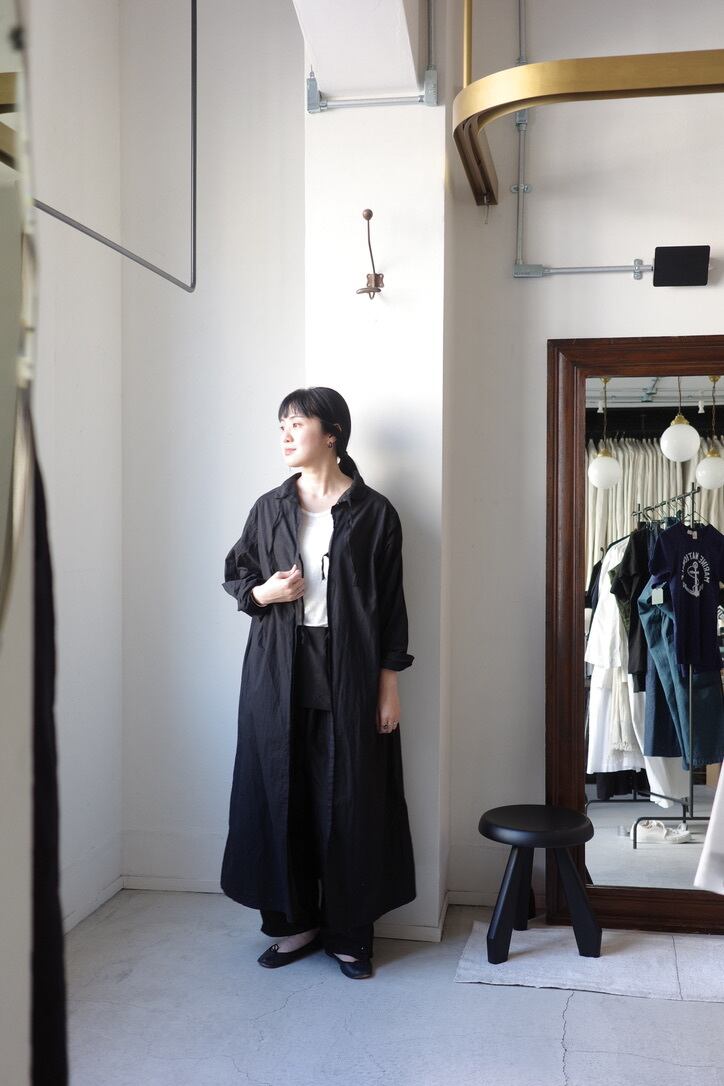 紐の結び方によって、シルエットに変化が。後ろ前逆に着用も可能です。画像はパンツに合わせていますが、ドレスや柄物を合わせレイヤードを楽しむのがオススメです。