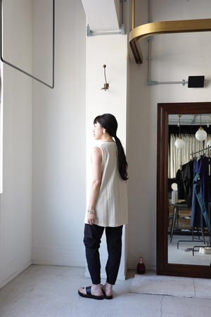 フロント部分が開いているので、着丈が長めのものに合わせるのがオススメですが、ご自身でボタン等付けてパンツとして取り入れるのも◉ワンピースにレギンスだと可愛らしかったり、着こなしの雰囲気にしっくりとこないなというとき、このパンツは絶妙なバランスで装いに取り入れることが出来ますよ。後ろのボタンでウエストサイズの調整が可能です。
