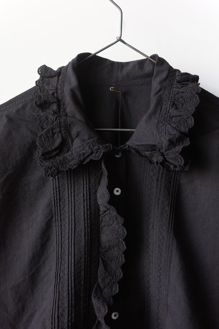 1900年代初頭フランスで作られたコットンブラウス。真っ黒に染めを施しました。襟、胸元、お袖にレースがあしらわれ、タックも細やかな作り。丁寧な手仕事に目を奪われます。ボタンはシェル(貝)、裾にはイニシャル刺繍施されています。目の詰まったコットンで、さらりとしていて年中取り入れていただける丁度良い生地感。サイズ感も良い1枚です。