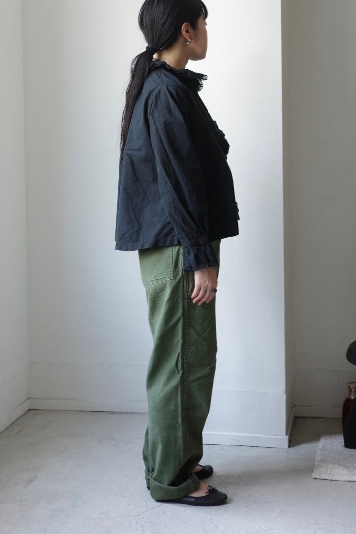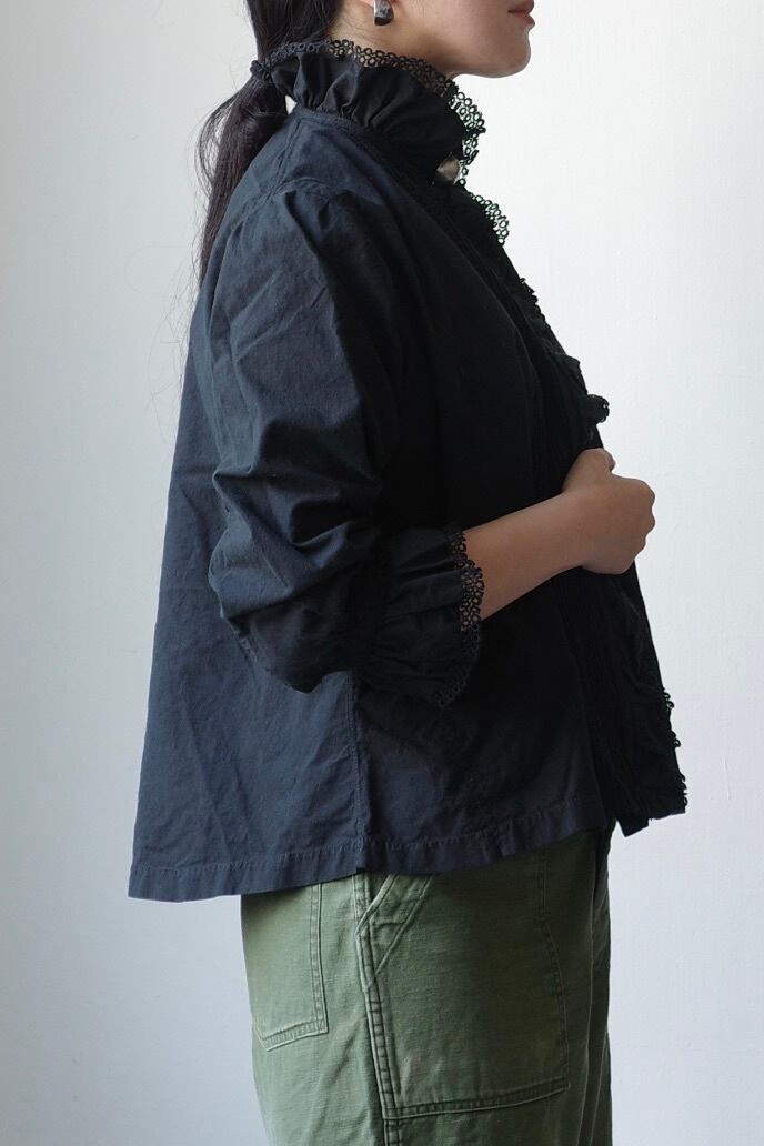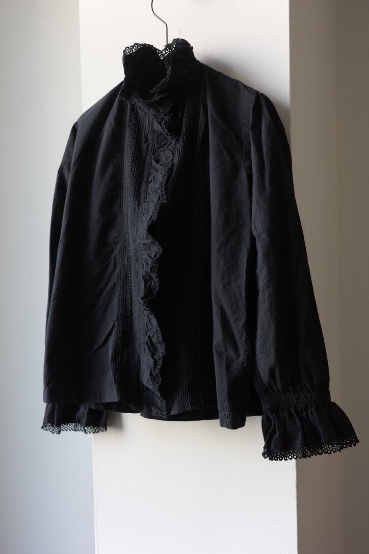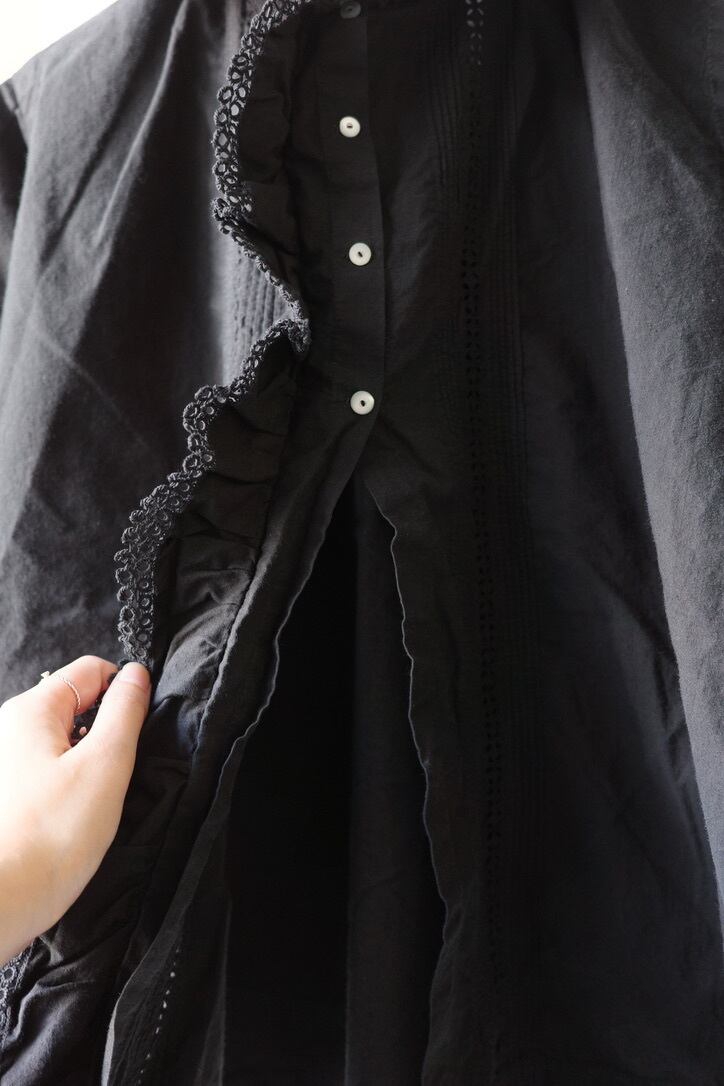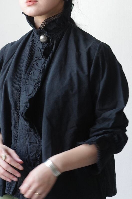 1900年代初頭フランスで作られたコットンブラウス。真っ黒に染めを施しました。襟、胸元、お袖にレースがあしらわれ、タックも細やかな作り。丁寧な手仕事に目を奪われます。シェル(貝)ボタンが3つのみなので、下が開く仕様です。気になる方はスナップボタン等付けても良いかと思います。目の詰まったコットンで、さらりとしていて年中取り入れていただける丁度良い生地感。