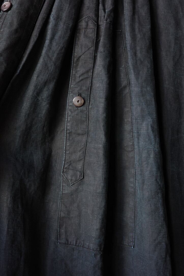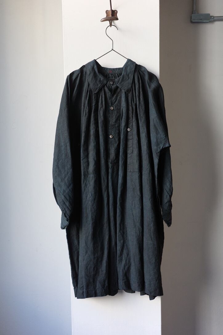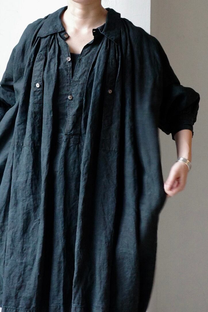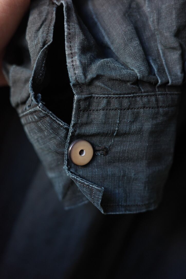 インディゴ染めを繰り返し繰り返し行うことによって、仕上がったブラックインディゴ。青が浮き出るような黒青の輝きが美しい一枚です。天然のシェル(貝)ボタンも全て綺麗なまま。贅沢に使われたリネン素材が動くたびに美しく揺れます。オーバーサイズなものではありますが、落ち感が出ますので不思議とボリュームが出過ぎずまとまりますよ。