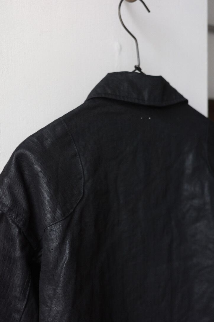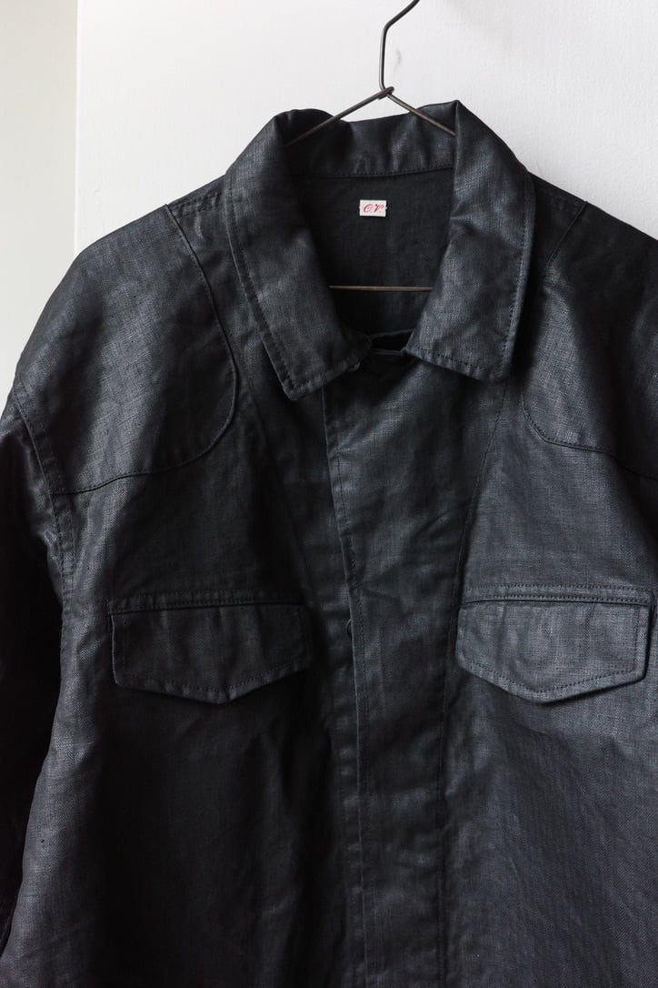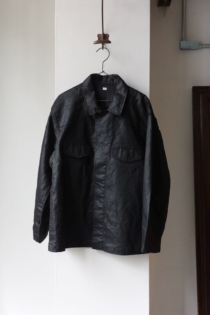素材は、1920~30年代のフランス軍にあるリネン生地を目指し制作したOUTILオリジナル。細やかなヘリンボーンの織り、高密度のハリ感は、まるでヴィンテージのような雰囲気の良さ。もはやヴィンテージを超える迫力です。艶を帯びたブラックリネンは洗練された印象で、土臭い男臭さもありながら、色気も感じる仕上がりとなっています。