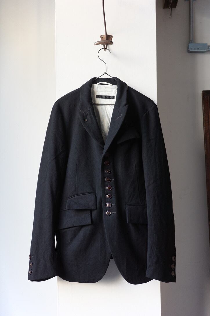 アンティークドール用のジャケットをデザインベースに、本格的なテーラード仕様で仕立てたジャケット。緻密なパターニングによる、立体的で美くしいシルエットです。本格仕様ながら、角度に変化を持たせた4つの大きなフラップポケットやフロントのズラリと並ぶ9個のボタンなど、KLASICAらしい遊びの効いたディテールが他には無いポイント。襟は立ち上げて着用する事もできるため、雰囲気をガラりと変えたスタイリングも可能に。内側には2つの胸ポケッと、腰にシガレットポケットが付属します。