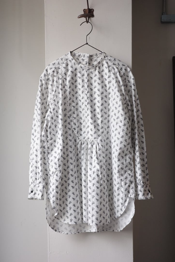 生地はライトモールスキン。ハリがありながらも、滑らかで着心地がよく、厚すぎず薄すぎず通年通して着用いただける肉感。ほんのりと光沢感があり、上品な印象です。目を引くのは、甘すぎない小花柄。フランスの1920sの抜染プリントを参考にした花柄です。