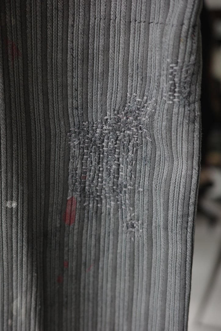 1940年代頃フランスで作られたワークパンツ。コットンピケ素材で仕立てられており、内側は起毛しております。本来は汚れが目立たないようにと考えられたグレー地のストライプ柄ですが、