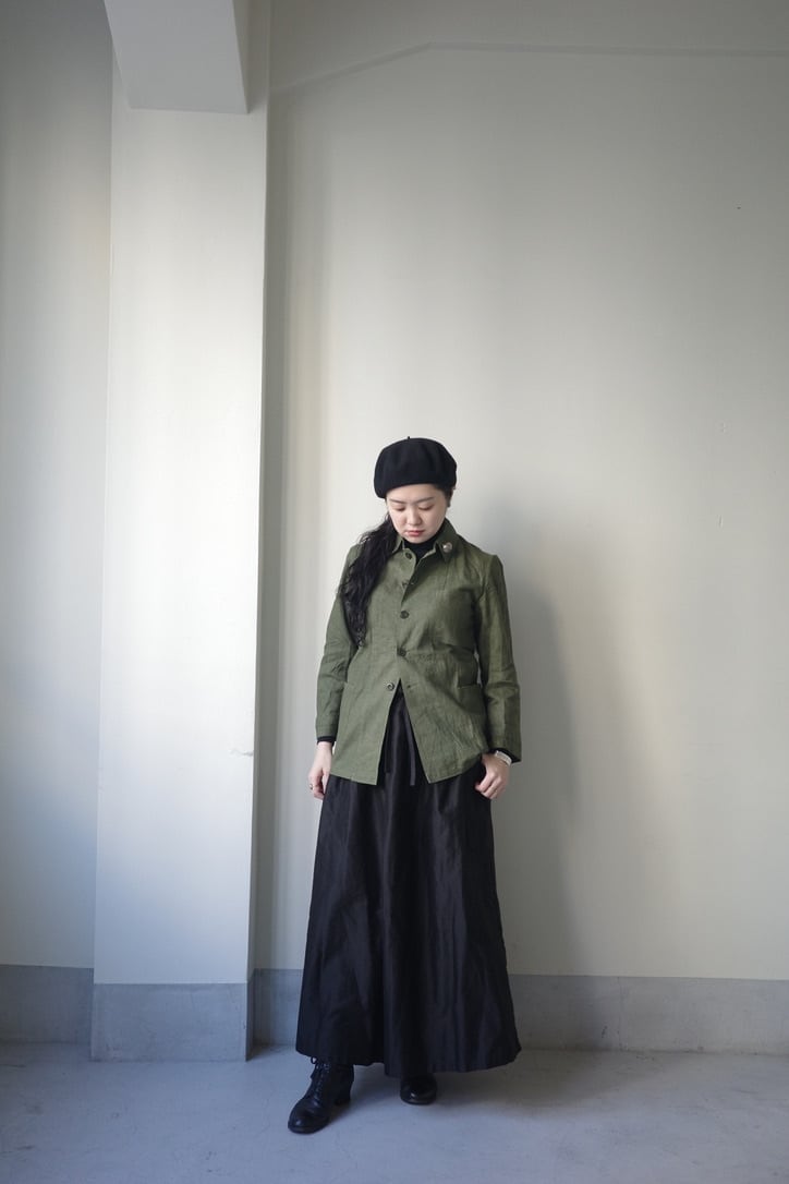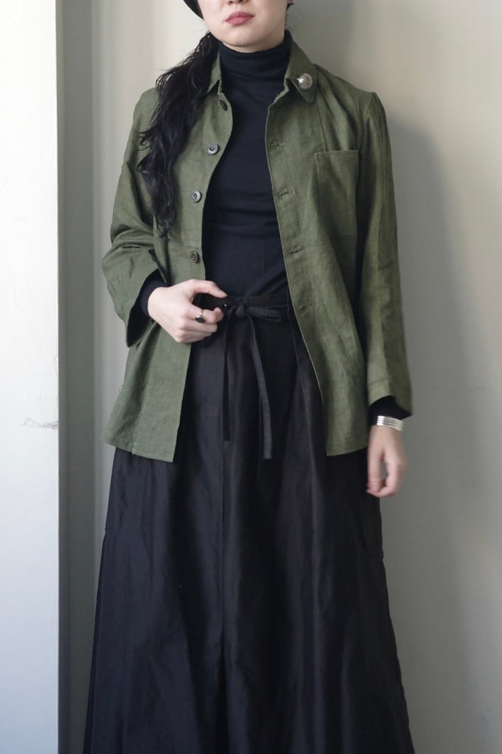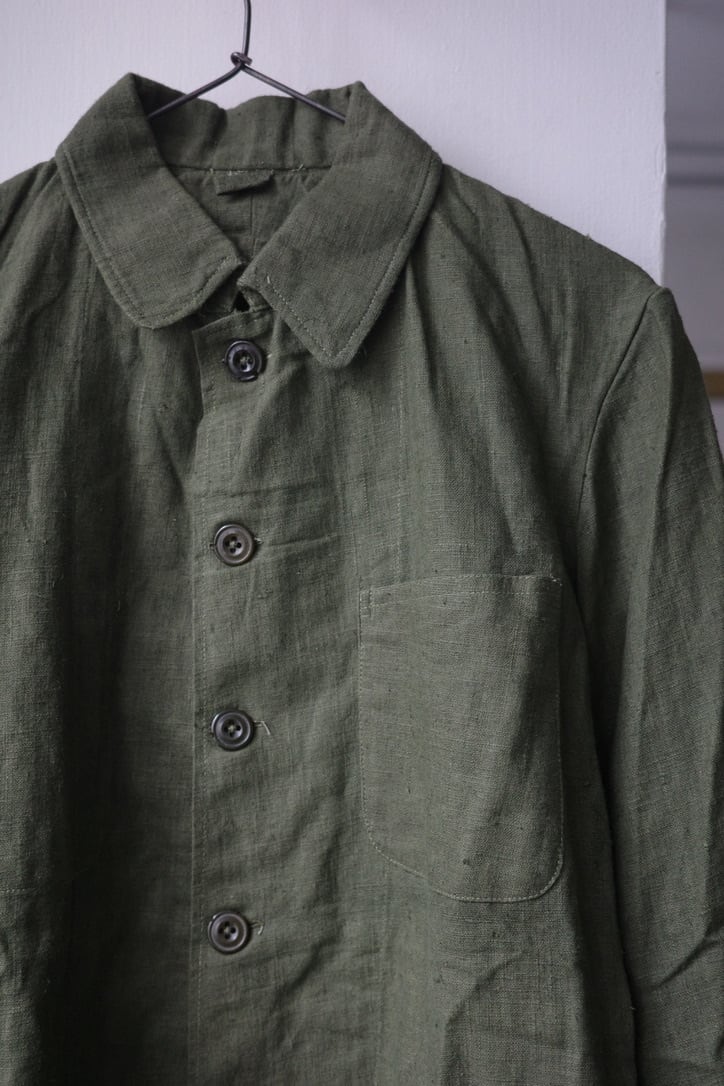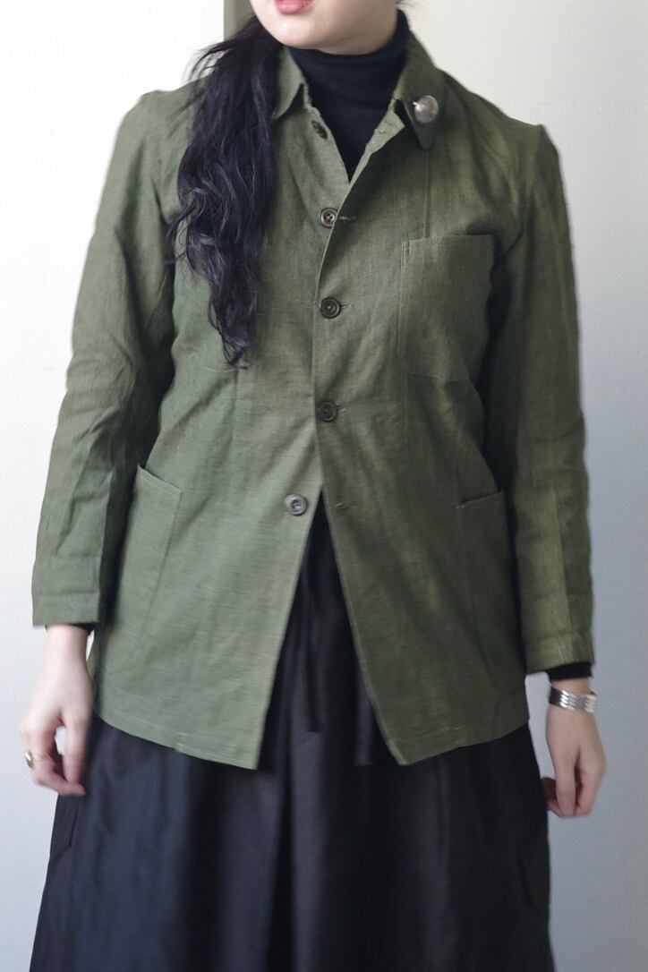 フランスで買い付けてきた1着。リネン素材で仕立てられており、シャツのように軽くて取り入れやすいジャケットです。まるでイギリス軍のグリーンデニムのような、オリーブグリーンの色味も魅力。