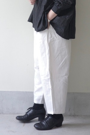 こちらは、アンティークリネンを使用したパンツです。手紡ぎ手織りによって仕立てられた、所々に見られるポコポコとしたネップ、不均一なリネンの風合いは表情豊か。時を経て雰囲気を増した”当時だからこそ”の風合いの良さは、最大の魅力だと思います。真っ白でもなく、生成りでもなく‥まさにアンティークリネンの色!という表現をしたくなるのですが、とにかく素朴で上品なお色です。
