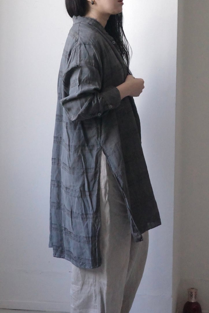 今季の新作となるロングシャツ。非常にワイドでロングなシルエットです。 カットオフのスタンドカラーに、スリットは深く、裾はスクエアにカットされております。バサッと羽織った感じもとってもサマになるので、軽いコートのように取りれるのもオススメです。
