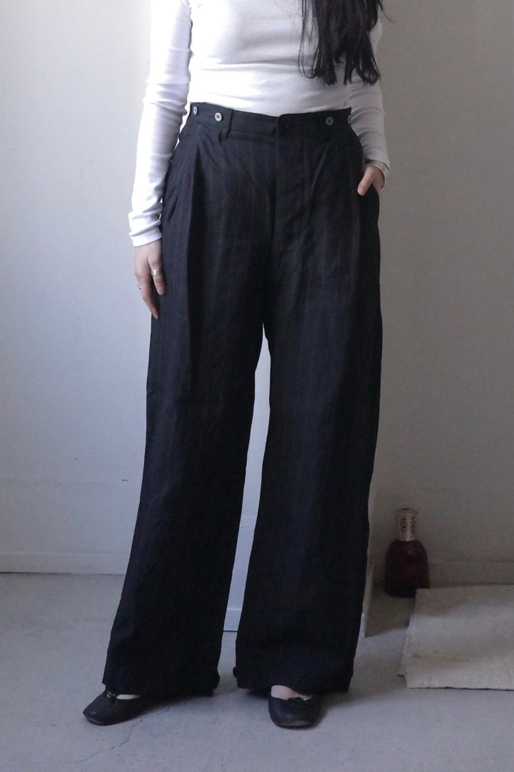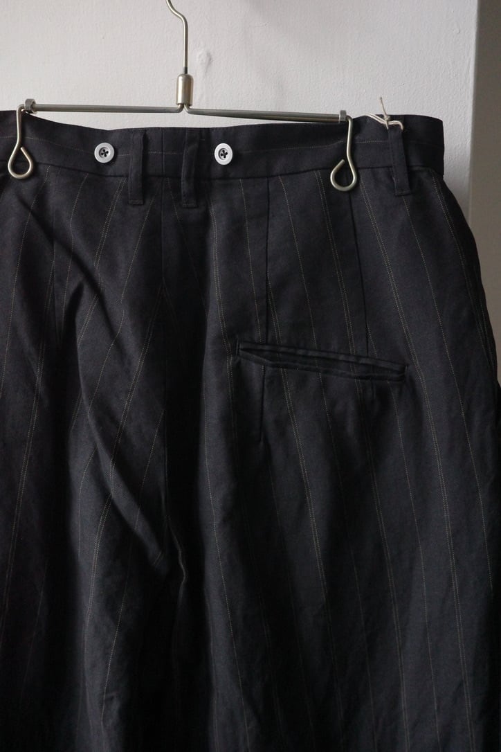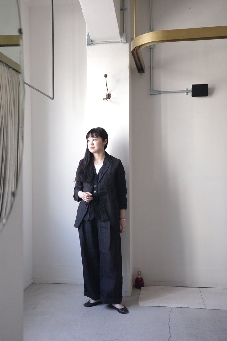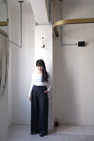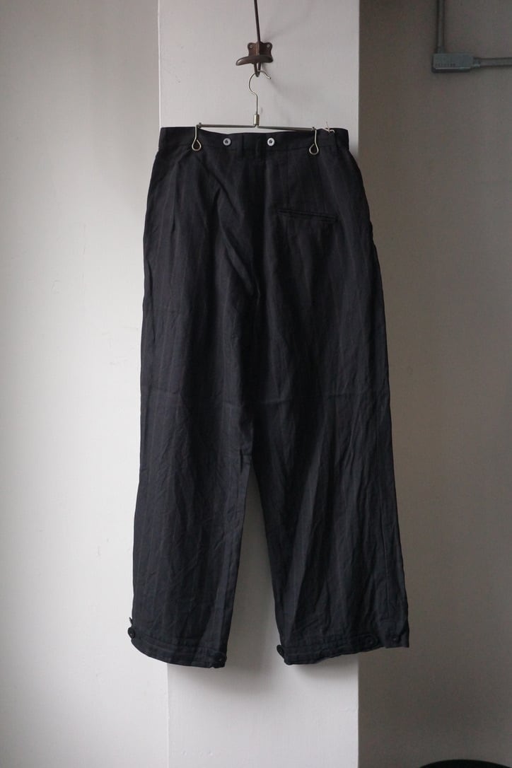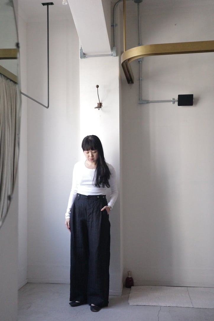 90年代初頭のアルマーニのルックブックの画像をベースにしたモデルです。ズドンと真っ直ぐ落ちる迫力抜群のワイドシルエット。サイドシームに近い位置からの斬新なタックは、一見野暮ったく見えるワイドパンツを立体的にし、絶妙なバランスを生み出しています。裾にはミリタリーライクなアジャスターが施されおり、ワイドシルエットからテーパードシルエットへの変更も可能。サスペンダーボタンも付いております。