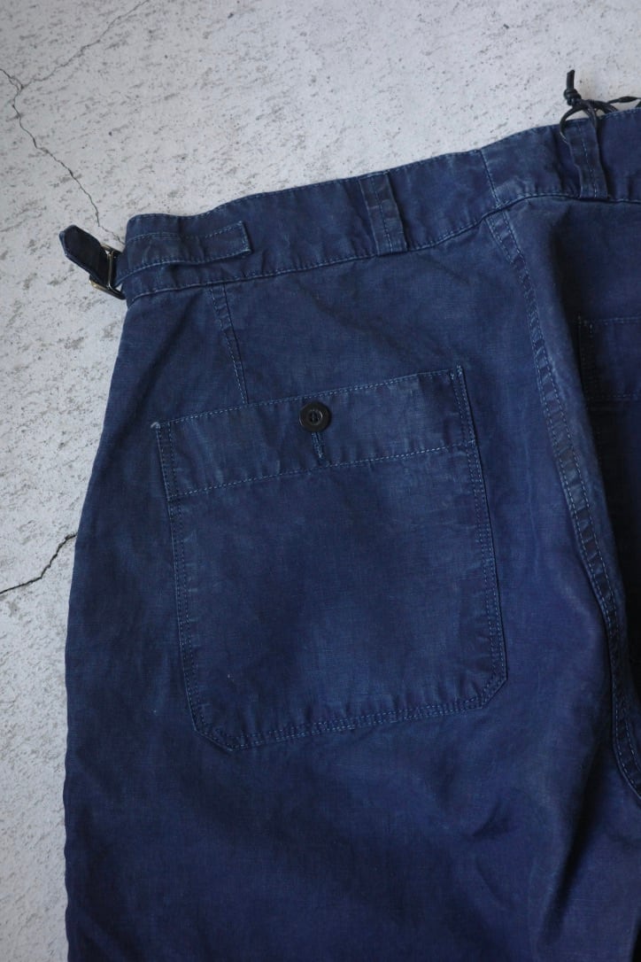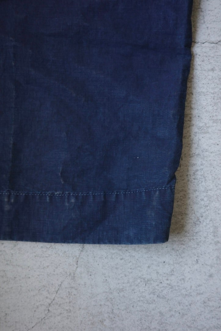 生地は、オリジナルの超高密度リネンの糸を細くし限界まで打ち込み、 当時の生地の様な光沢を染めても残るように製作。染め職人と日々研究を重ね、より当時の色に近い染め方と思われる、 何度も濃色にインディゴ染と柿渋染を焙煎し青く黒い濃色にしています。