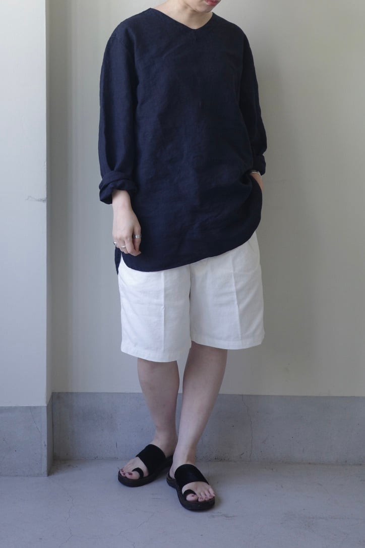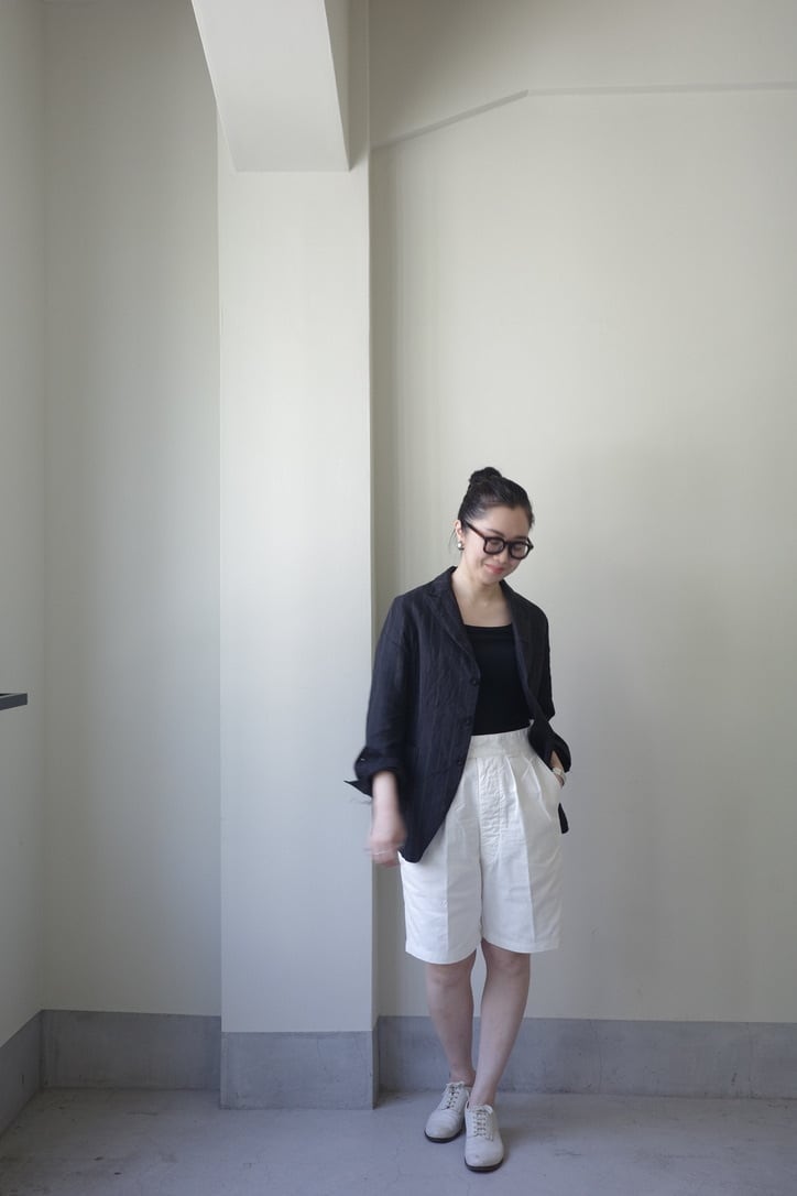 ウエスト周りはたっぷりとワイドな作りなので、サイドのアジャスターでぎゅっと締めてハイウエストでも、腰で落として穿くのも、着丈の長さが変わって違った印象に。(ベルトループも付いてます)適度なボリュームと、膝にかかるくらいの着丈は、ショーツを穿き慣れない方でもすんなり取り入れられるバランスだと思います。内側にはボタンが付いており、ボタン式のサスペンダーでずるっと合わせるのも夏のシンプルな装いにオススメです。
